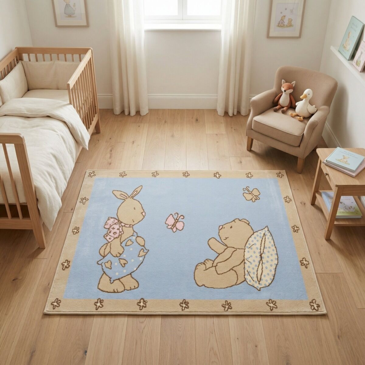 Tapis enfant petit ourson et lapin bleu et beige 60x100