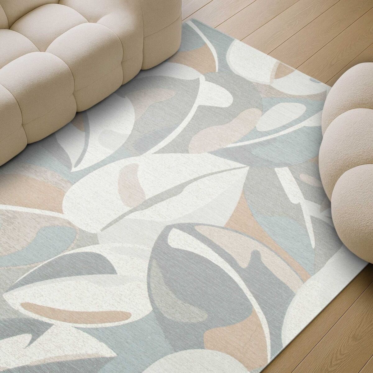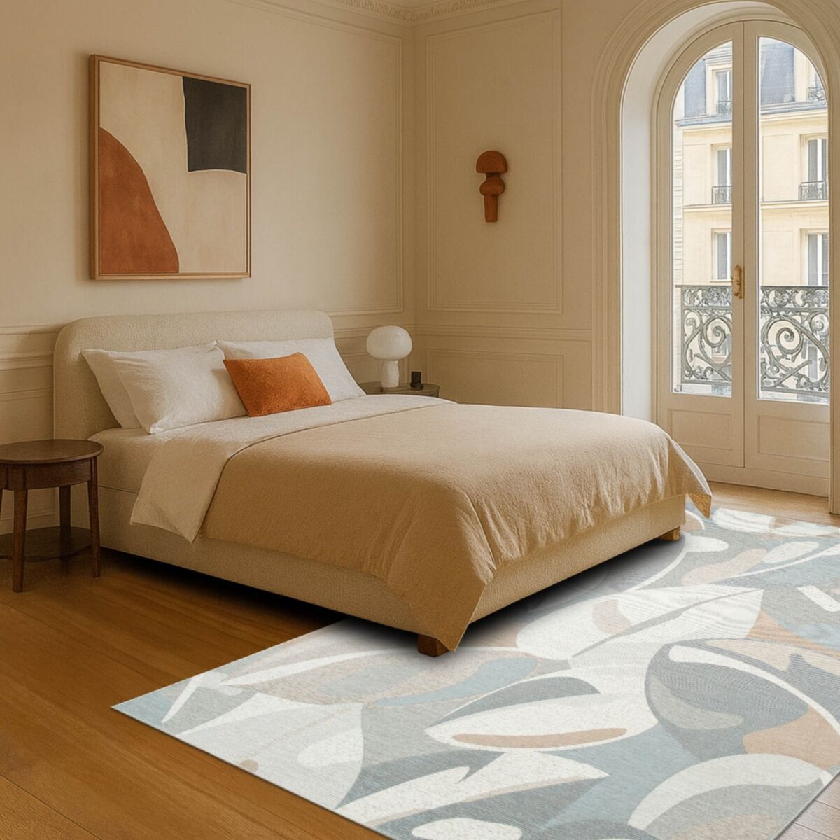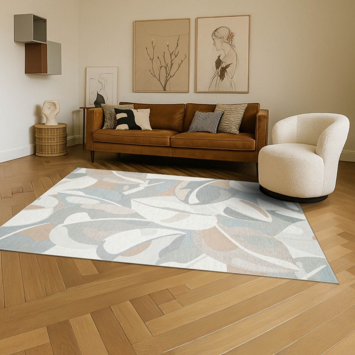 Le tapis Anne Feuilles puise son inspiration dans les formes de la nature et apporte une touche graphique et apaisante à votre intérieur. Ses grandes feuilles stylisées, dessinées dans une palette de tons doux mêlant beige clair, gris, bleu-gris et taupe, composent un motif lumineux qui crée une ambiance sereine, moderne et harmonieuse.