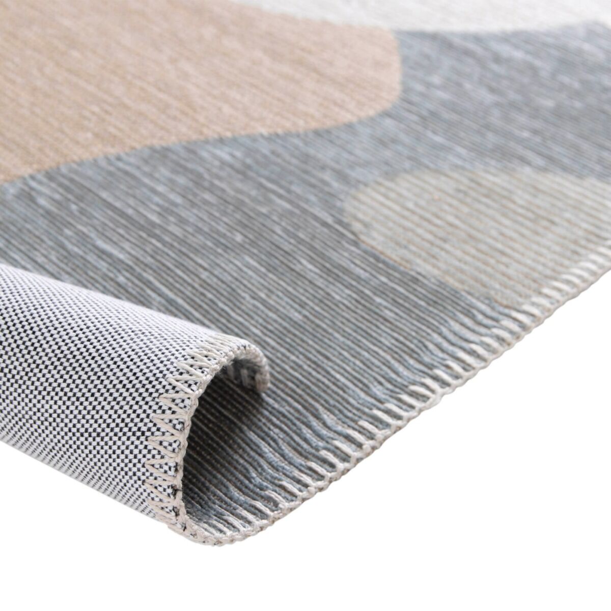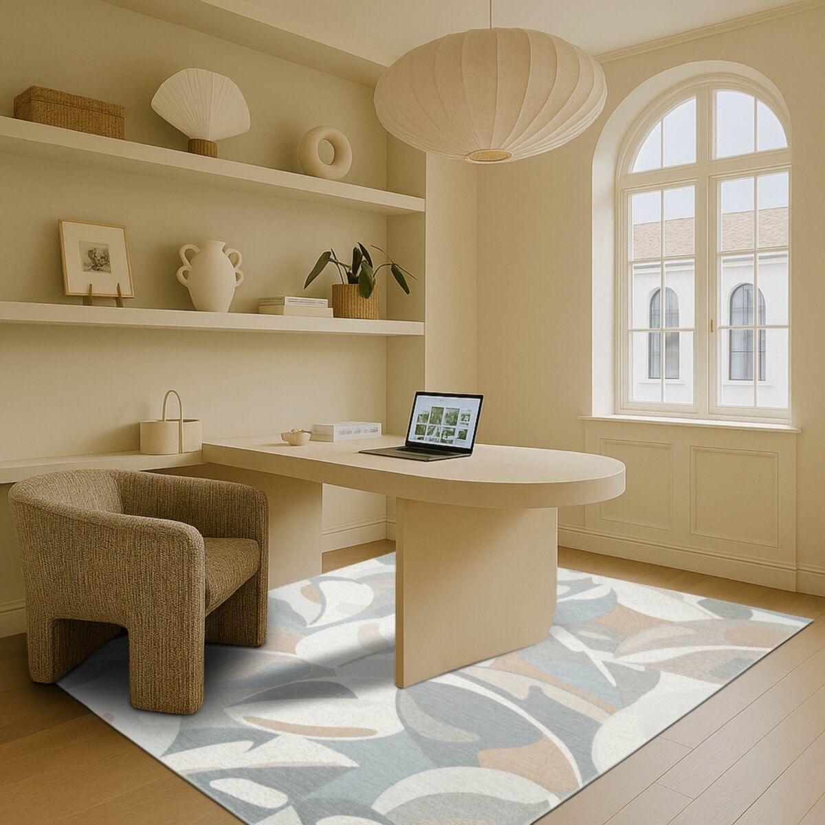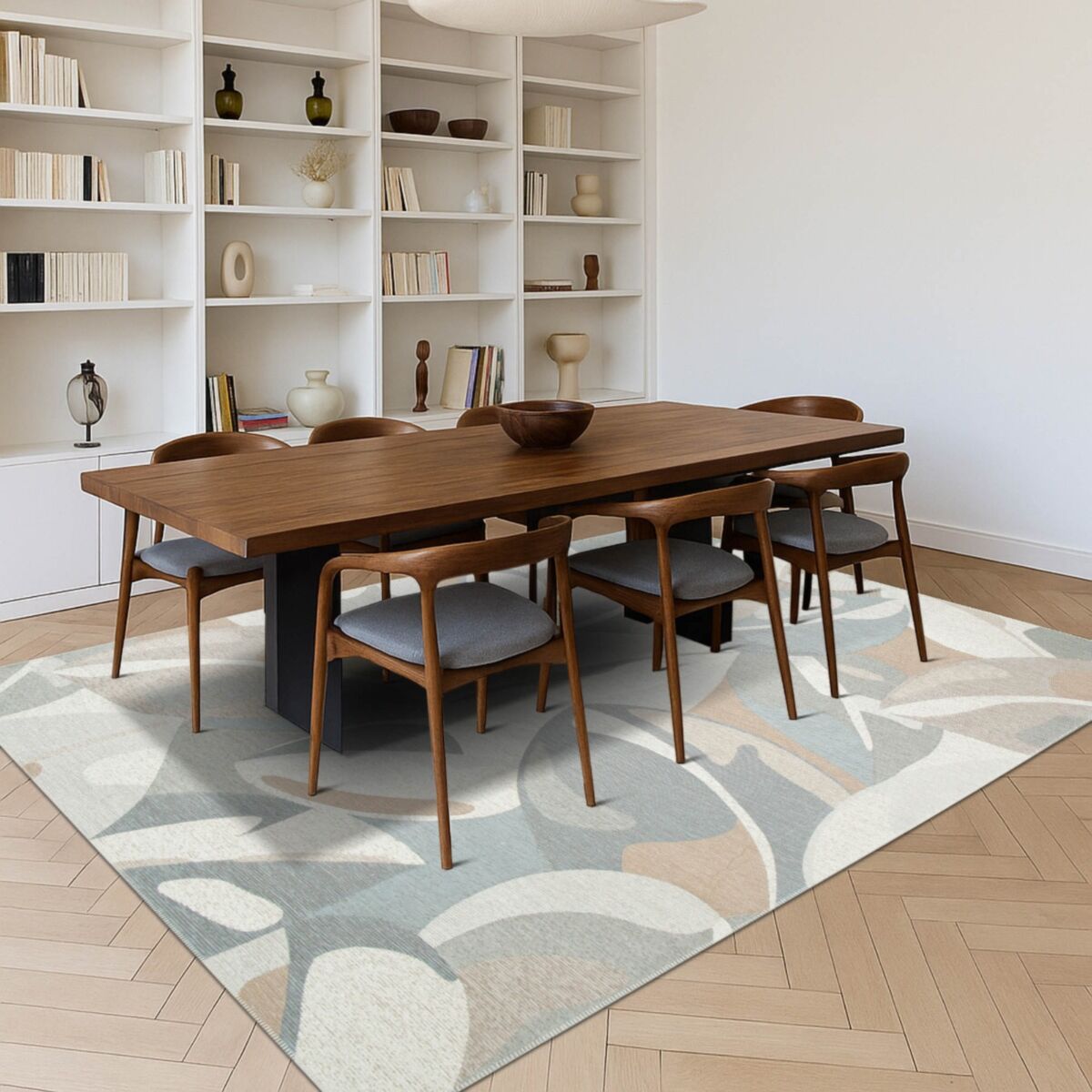 Le tapis Anne Feuilles puise son inspiration dans les formes de la nature et apporte une touche graphique et apaisante à votre intérieur. Ses grandes feuilles stylisées, dessinées dans une palette de tons doux mêlant beige clair, gris, bleu-gris et taupe, composent un motif lumineux qui crée une ambiance sereine, moderne et harmonieuse.