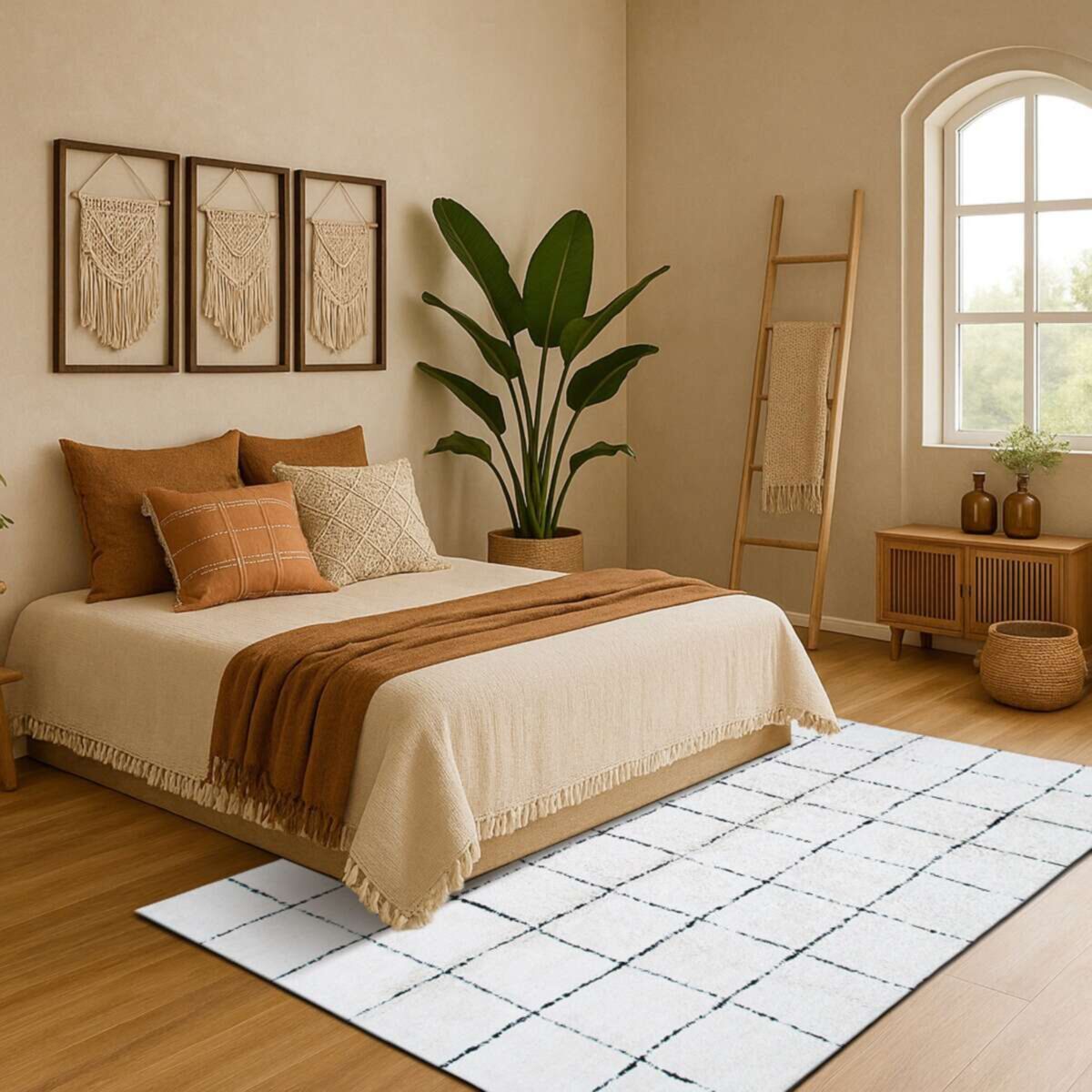 Avec son motif géométrique façon carreaux et son toucher doux, ce tapis style berbère revisité apporte une note chaleureuse et authentique à vos intérieurs. Son design épuré, inspiré des tapis traditionnels marocains, s’harmonise aussi bien dans une ambiance bohème que contemporaine.