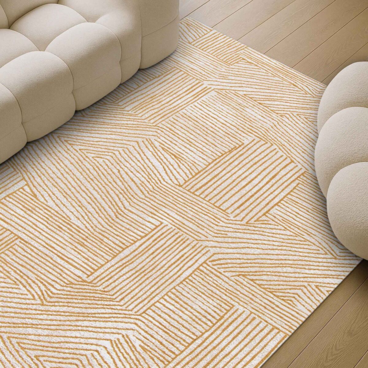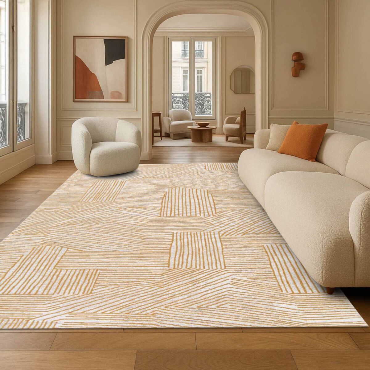 Le tapis AXEL TISSAGE se distingue par son motif graphique fait de lignes élégantes et contemporaines, jouant sur des contrastes subtils entre beige doré et crème. Son design linéaire, à la fois moderne et chaleureux, apporte une vraie personnalité à votre intérieur tout en restant facile à associer.