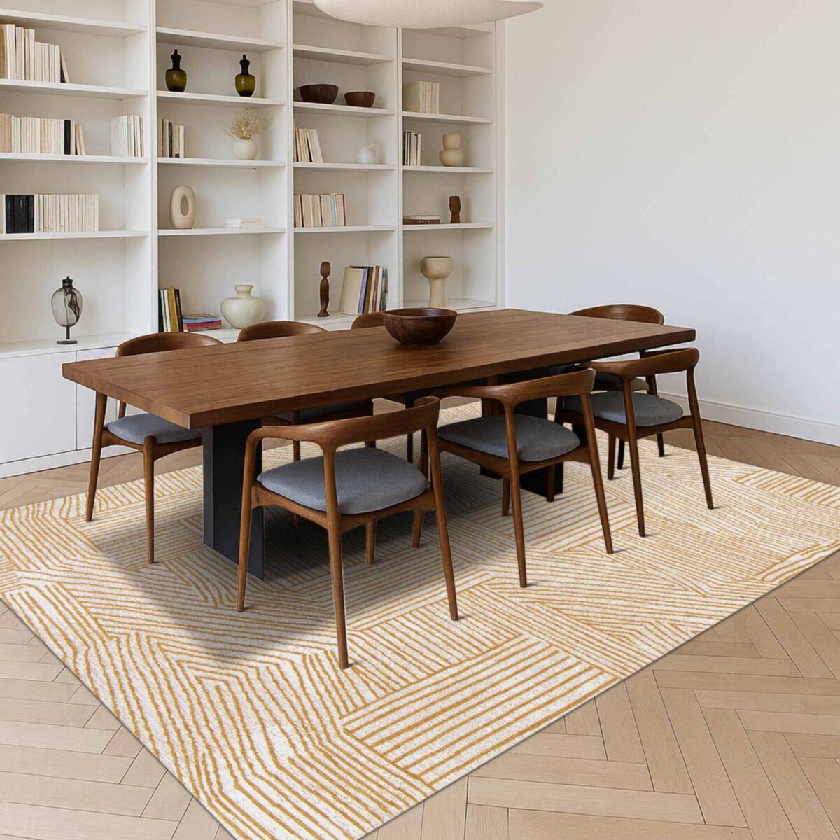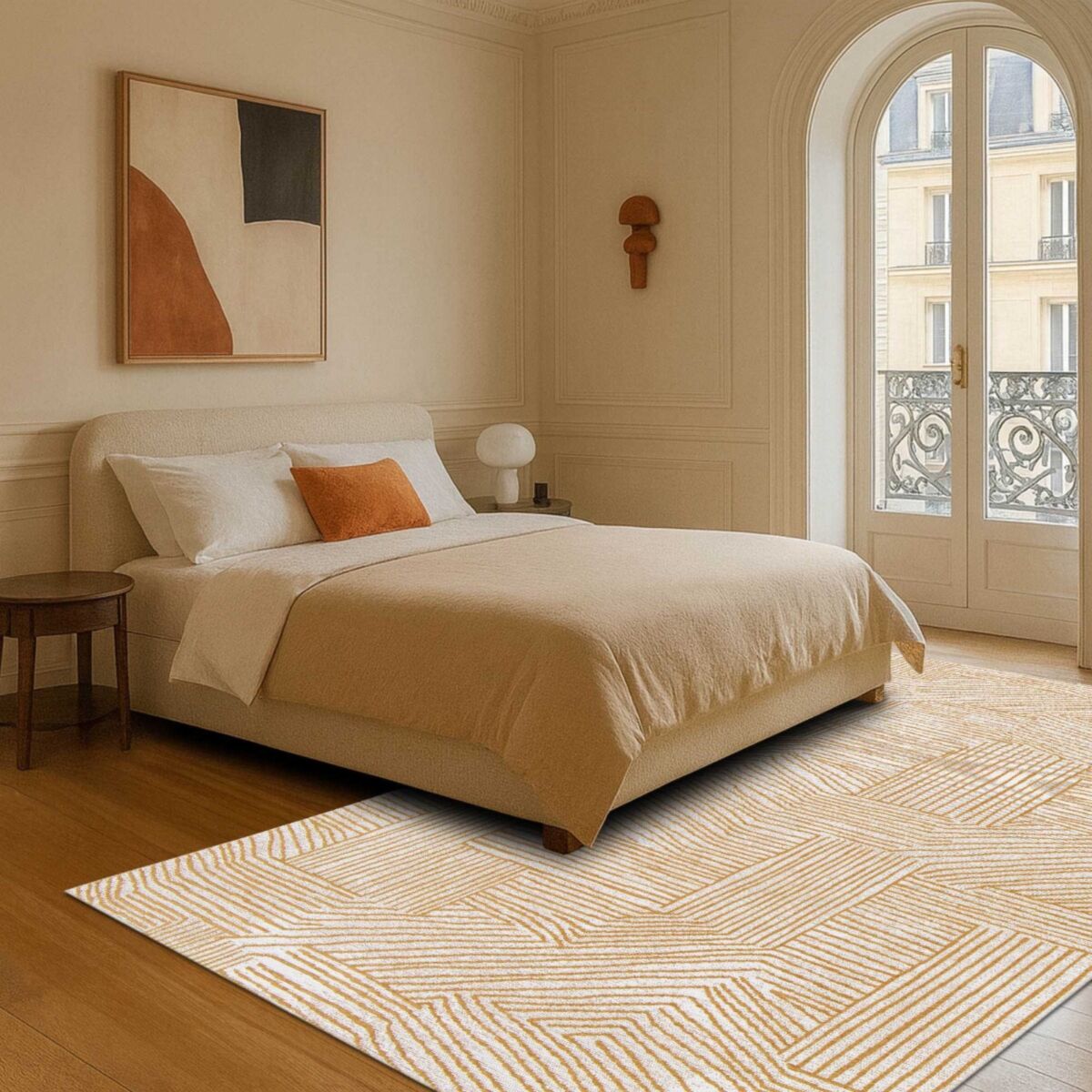 Le tapis AXEL TISSAGE se distingue par son motif graphique fait de lignes élégantes et contemporaines, jouant sur des contrastes subtils entre beige doré et crème. Son design linéaire, à la fois moderne et chaleureux, apporte une vraie personnalité à votre intérieur tout en restant facile à associer.