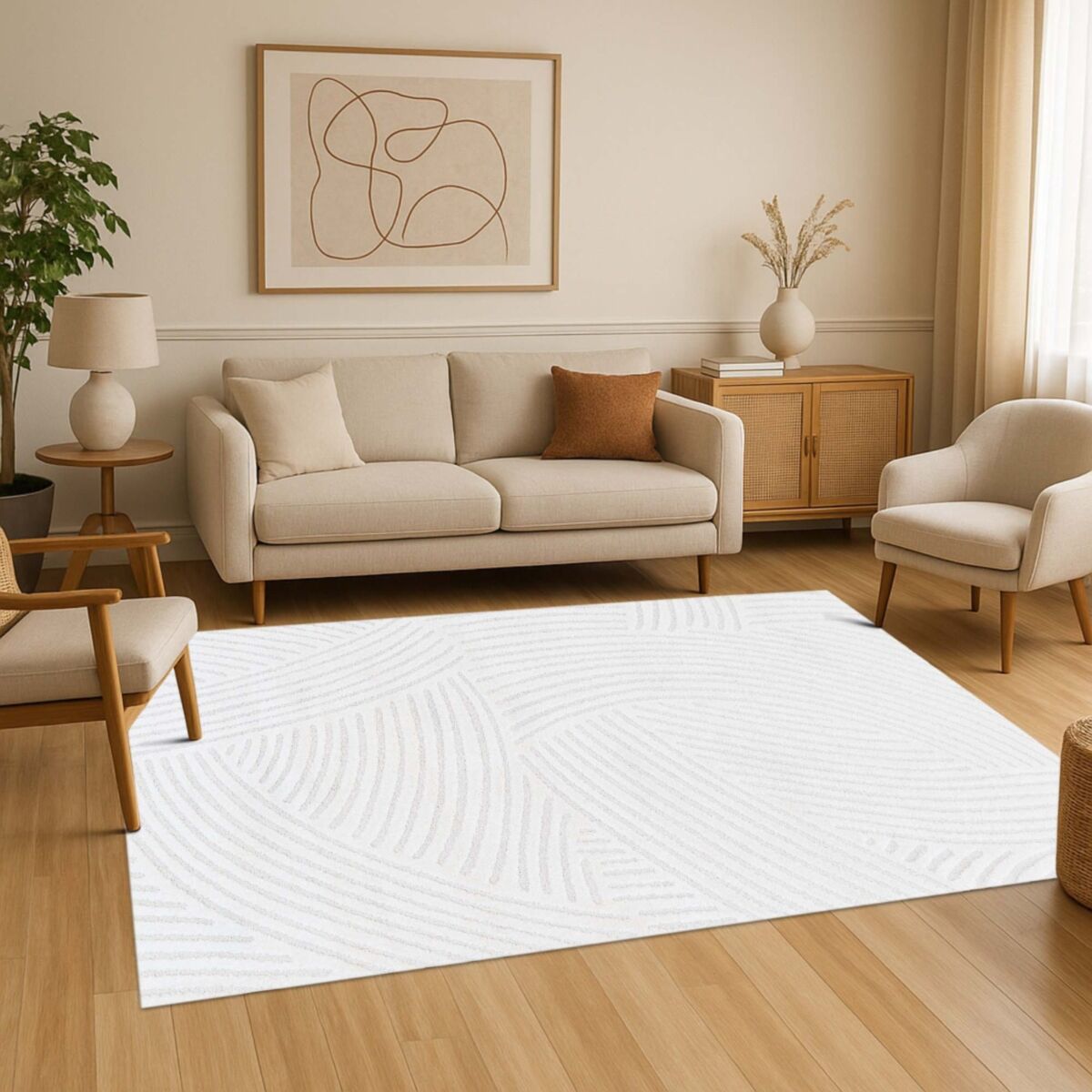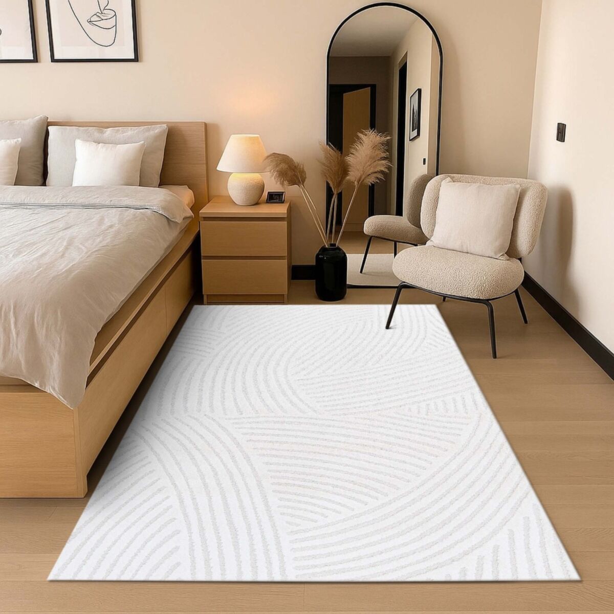 | description du produit_ES | Transforme tu interior en un auténtico refugio de suavidad con esta alfombra de relieves curvos certificada Oeko-Tex, diseñada para aportar calidez, serenidad y una elegancia moderna a tu decoración. Tejida a partir de una mezcla de poliéster shrink y microfibras de polipropileno ultrasuaves, esta alfombra ofrece un tacto excepcionalmente mullido. Su acabado 3D aporta profundidad manteniendo una estética minimalista y relajante, ideal para interiores contemporáneos, Japandi, acogedores o de estilo escandinavo. Su fabricación de alta calidad garantiza una excelente durabilidad: una alfombra que no suelta pelusa, resistente y fácil de mantener. Compatible con calefacción por suelo radiante, se adapta fácilmente a un salón, dormitorio o zona de descanso gracias a su color blanco crudo luminoso y atemporal. Características: