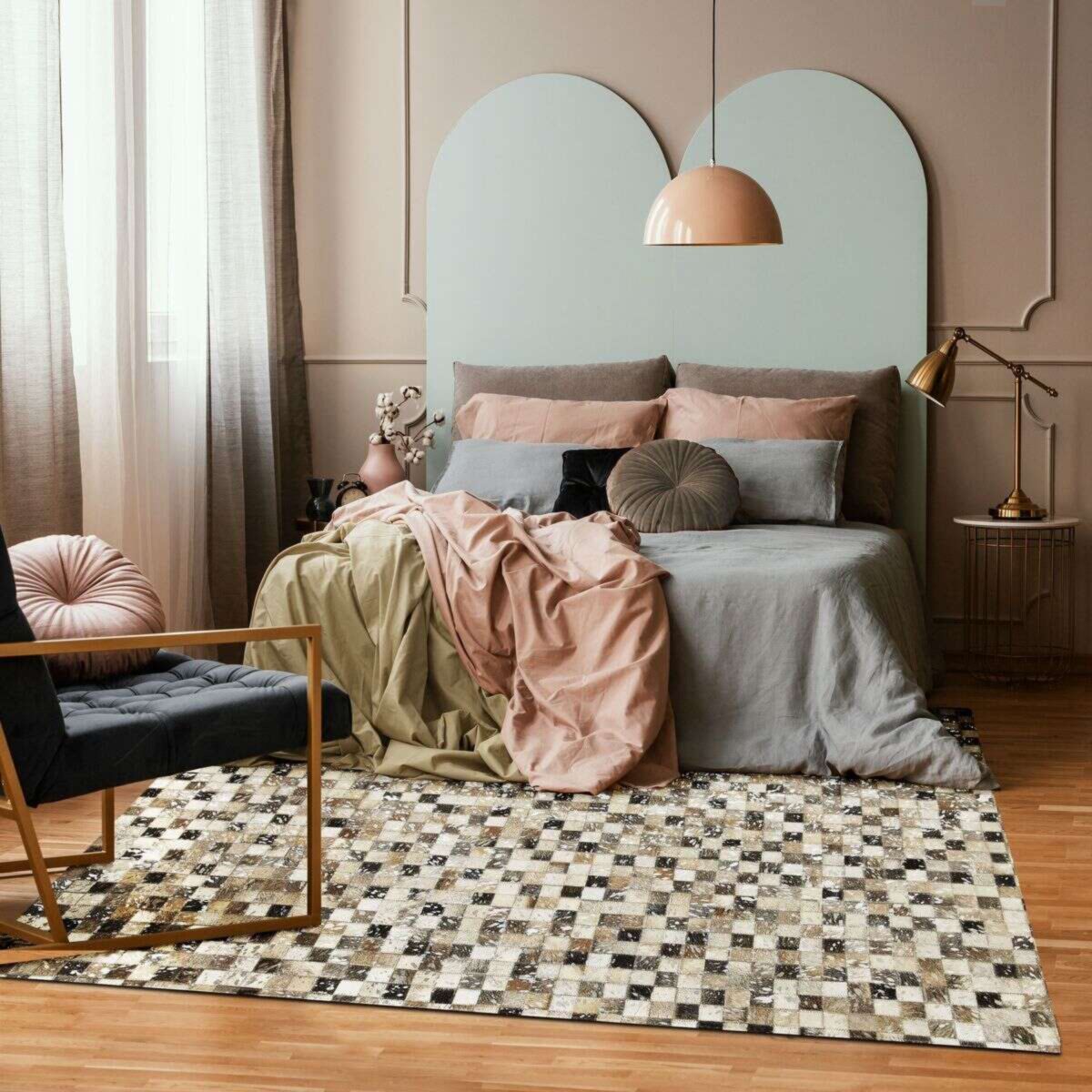 | description du produit_ES | Aporta carácter a tu interior con esta alfombra de cuero reciclado, diseñada en patchwork de pequeños cuadros ensamblados con esmero. Su motivo de damero renovado juega con una paleta de tonos naturales — beige, gris claro, negro y blanco roto — realzada con discretos toques plateados que capturan la luz con elegancia. Este modelo combina un espíritu natural con acabados refinados, perfecto para realzar un salón contemporáneo, una oficina luminosa o un dormitorio de estilo industrial chic. Hecha a mano, cada pieza es única y refleja un saber hacer artesanal y comprometido con el medio ambiente. Detalles tendencia : Composición : cuero auténtico reciclado Motivo : patchwork de cuadros estilo damero |