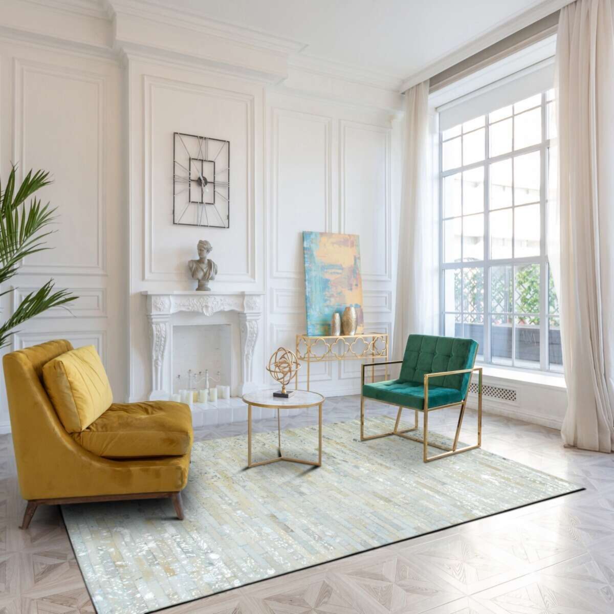 Avec son patchwork de cuir sur feutre, ce tapis aux reflets argentés capte la lumière et réchauffe l’atmosphère en un clin d’œil. Chaque pièce est unique, comme un bijou fait main, mêlant matières brutes et détails précieux.