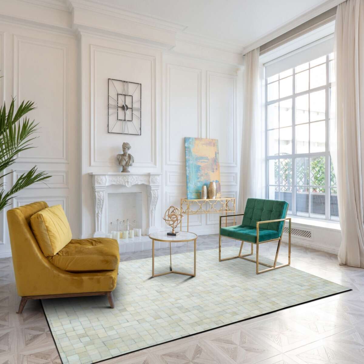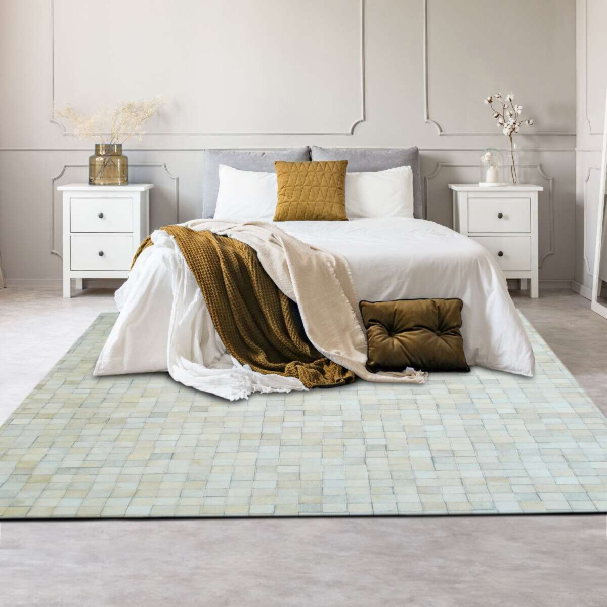 Chaque carreau est unique, et l’ensemble crée un effet visuel raffiné et apaisant, à mi-chemin entre l’artisanat et le design contemporain. Sa finition structurée et sa surface texturée font de ce tapis un allié de caractère dans un salon chic, une chambre lumineuse ou un bureau minimaliste.