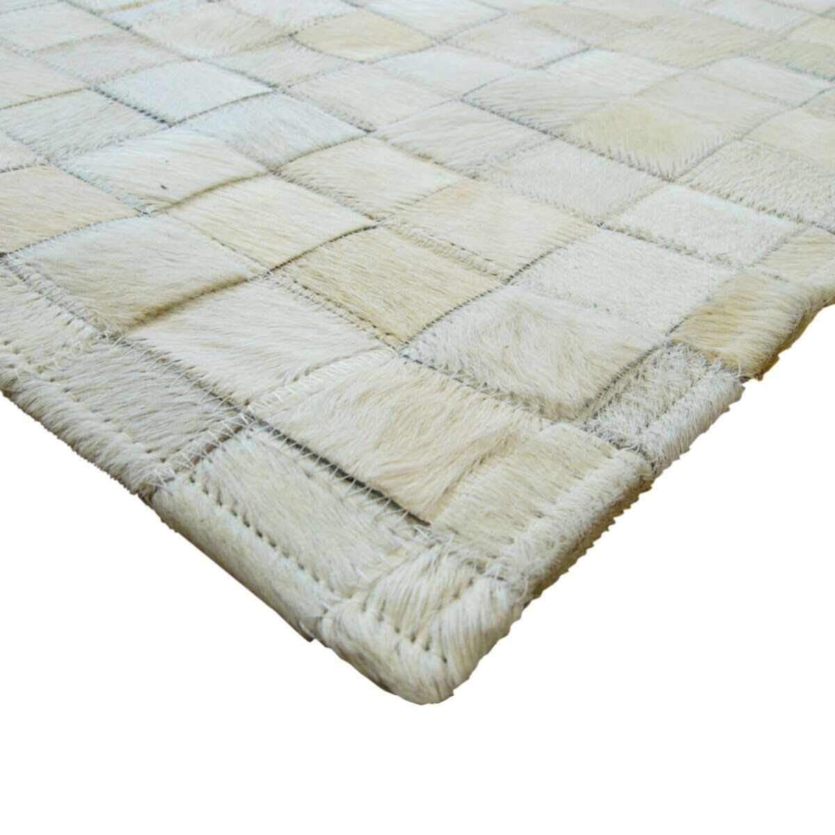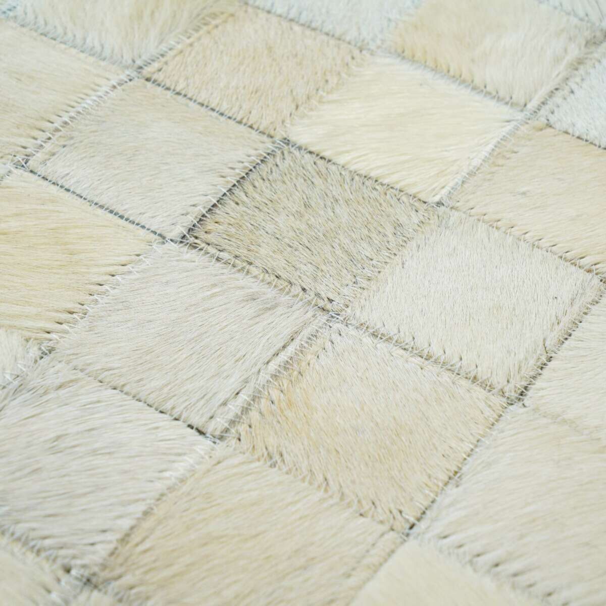 Invitez l'élégance brute et la lumière dans votre intérieur avec ce tapis en patchwork de cuir naturel, subtilement assemblé à la main sur un support en feutre discret. Véritable pièce décorative, il séduit par son motif mosaïque de carrés ton sur ton, dans une palette de blancs et de beiges chauds, aux reflets légèrement soyeux.