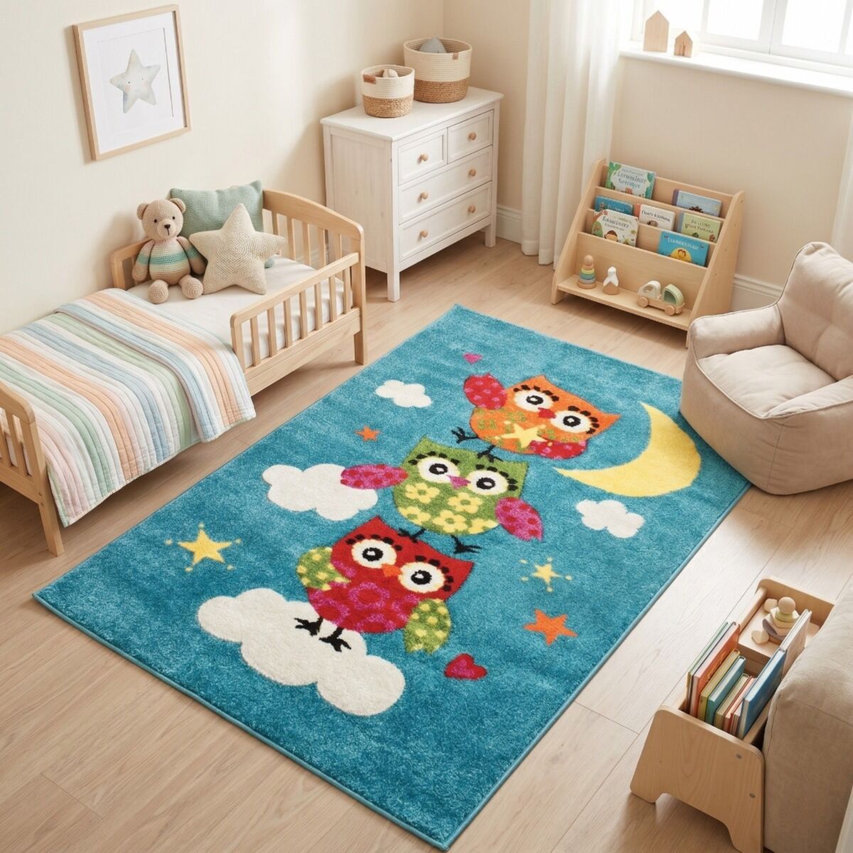 Tapis enfant toucher laine doux imprimé chouettes bleu 100x150