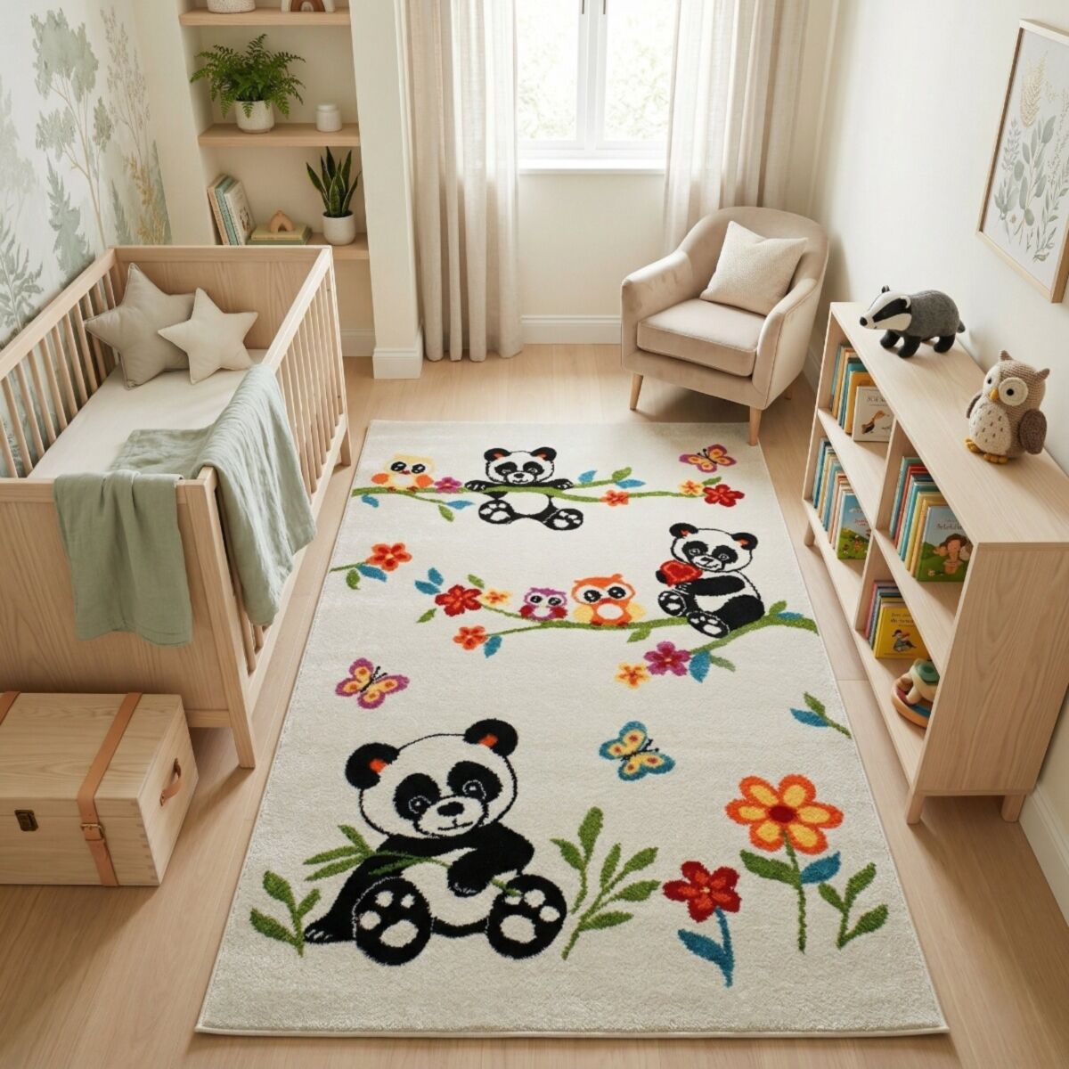 Apportez une touche ludique et chaleureuse à la chambre de votre enfant avec ce joli tapis décoré de pandas malicieux, de hiboux colorés et de papillons virevoltants. Son fond clair met en valeur les motifs vifs et joyeux qui éveilleront l’imagination des petits.