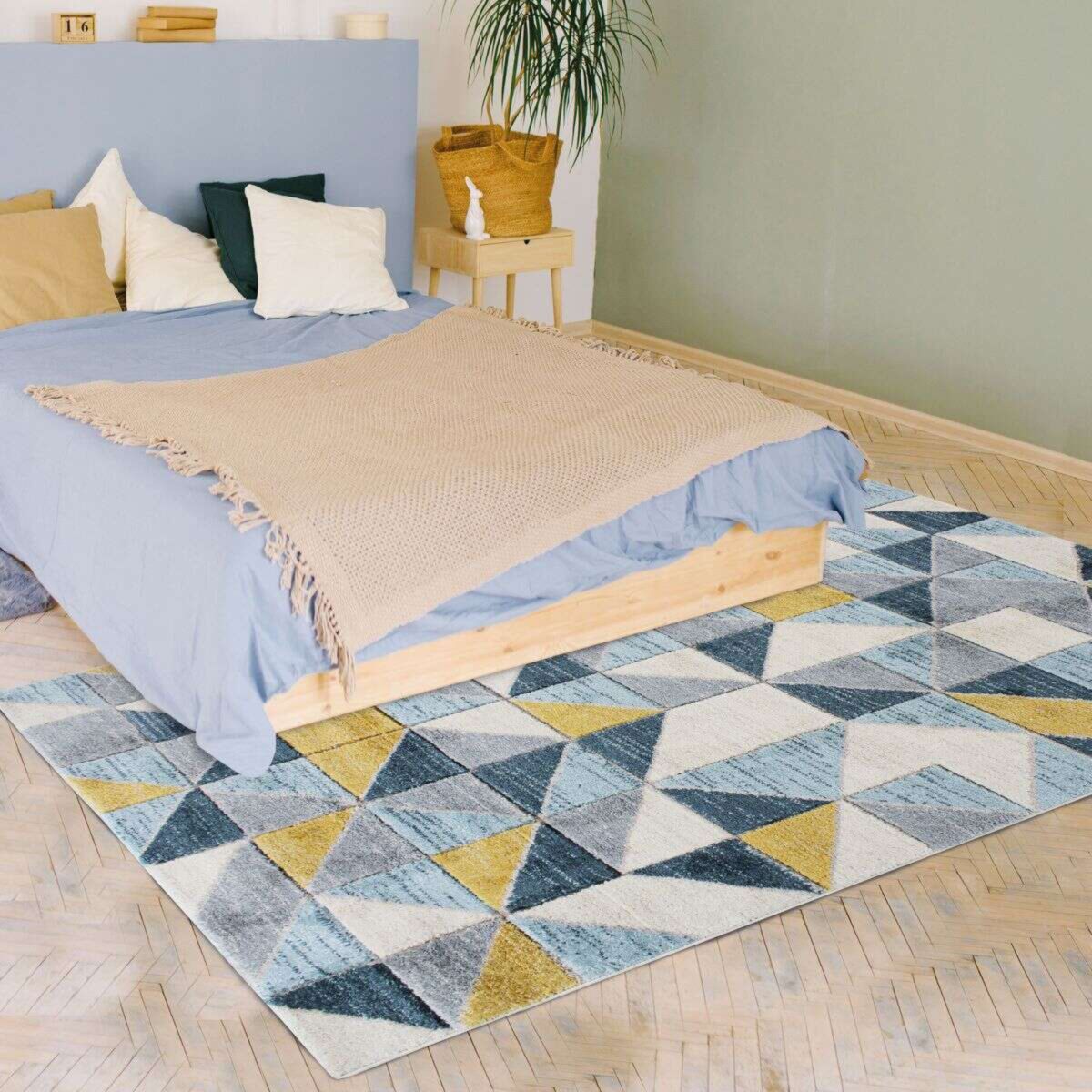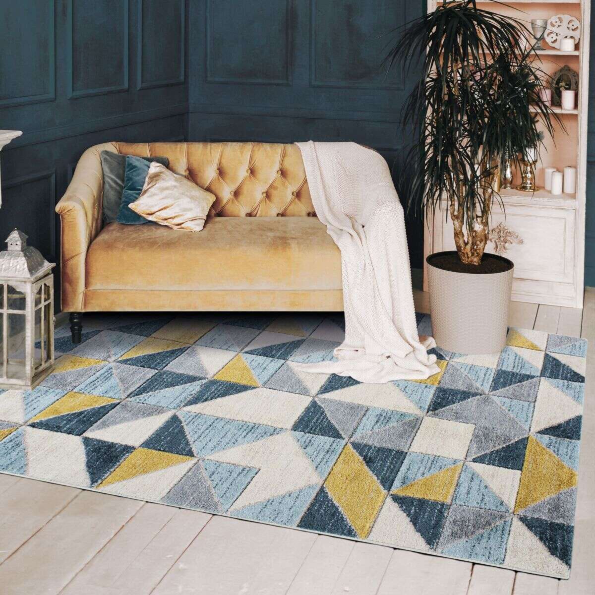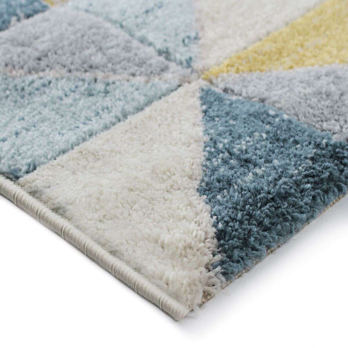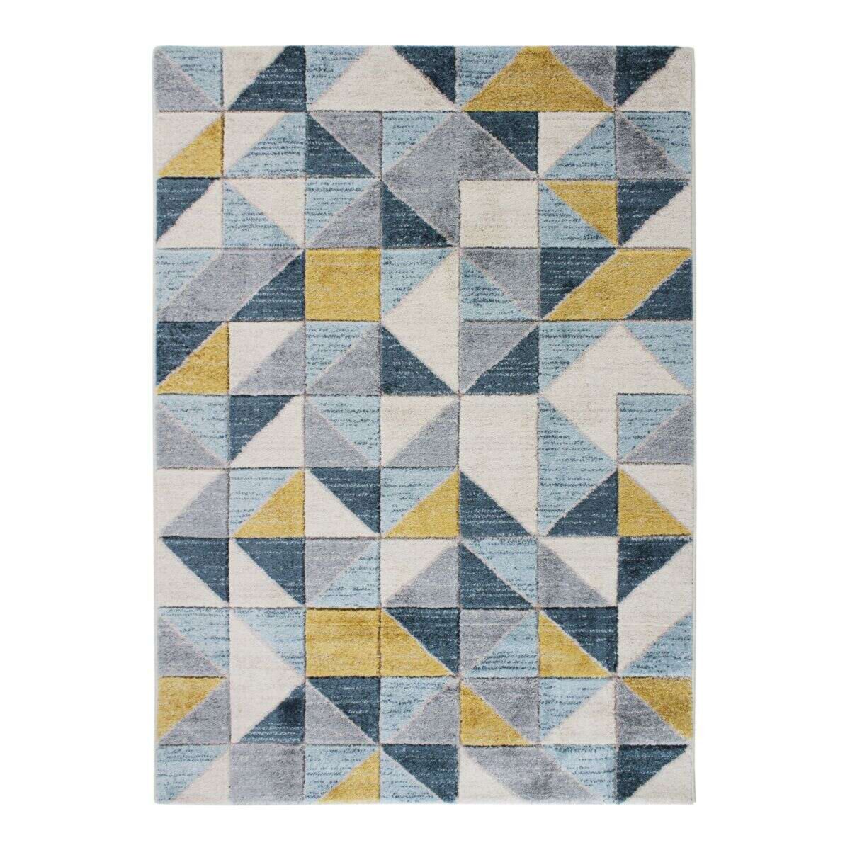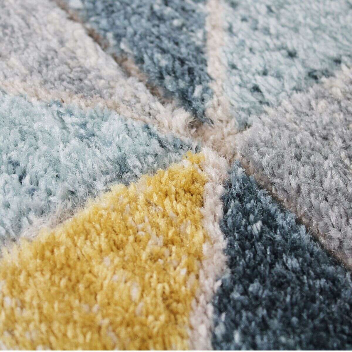 Tapis aspect laineux motif carrés bleu et jaune 120x170