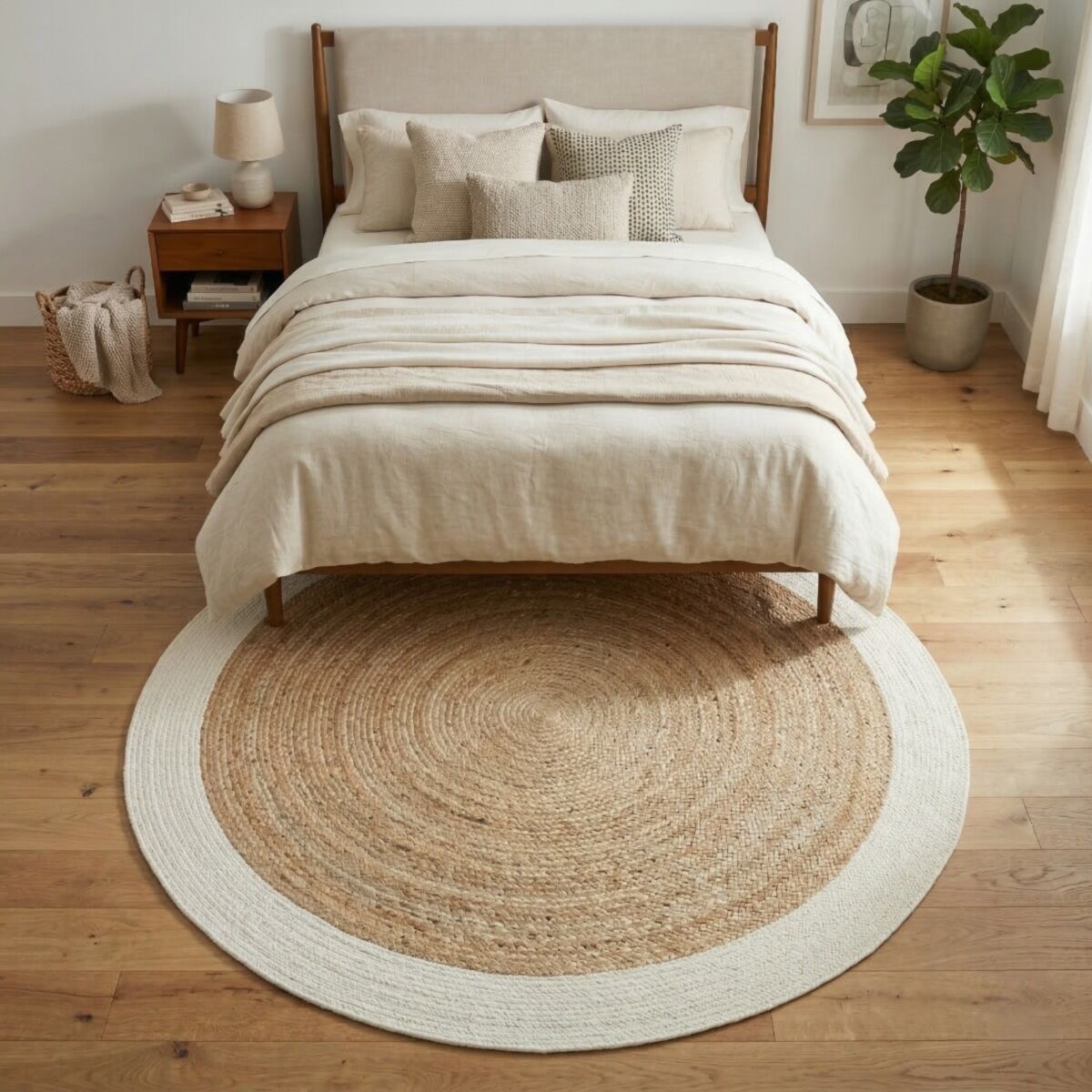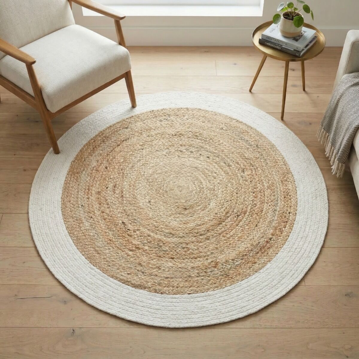 Sublime tapis rond tressé en jute et coton parfait pour rendre une ambiance chaleureuse et ethnique.