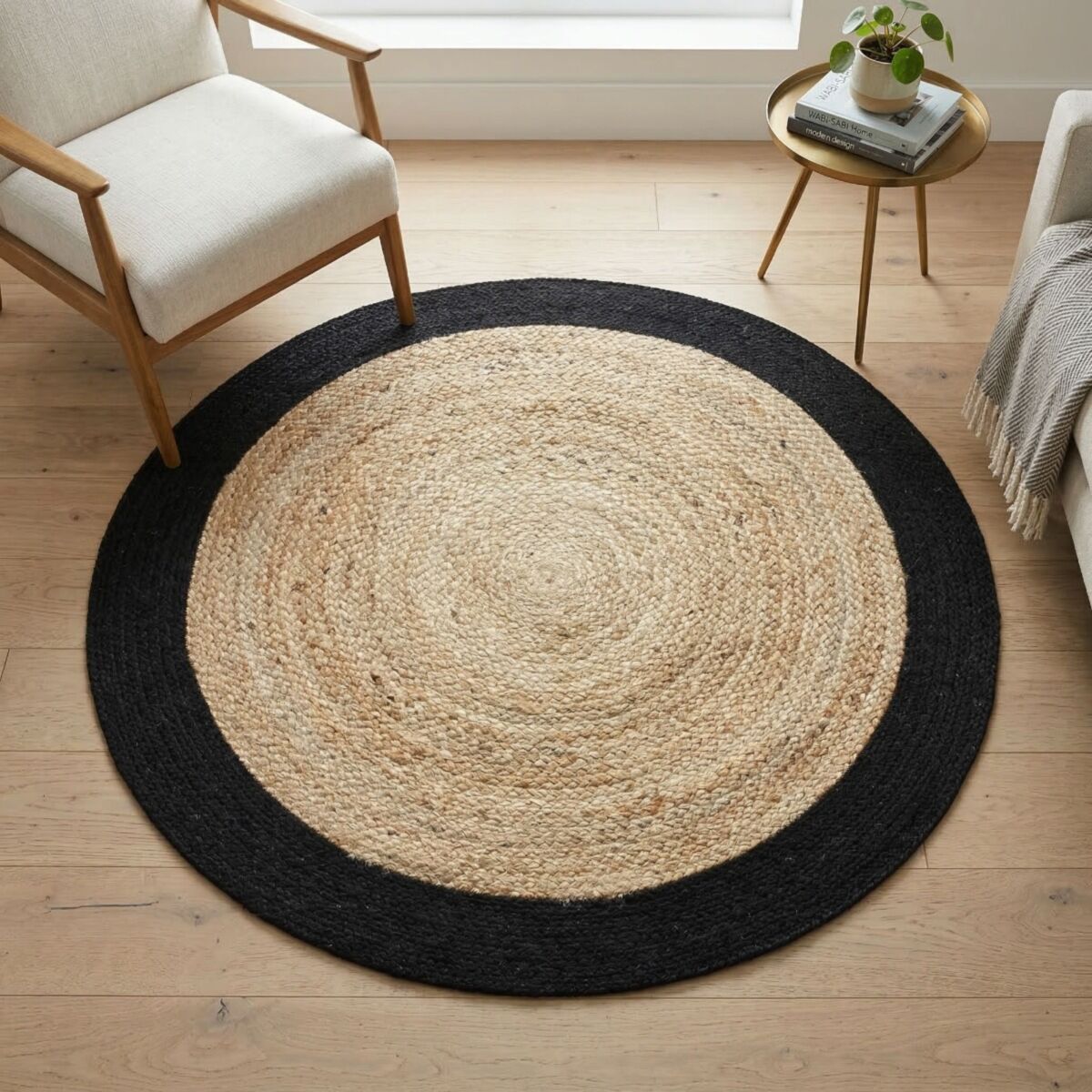 Tapis rond en jute et coton bande noire diam.70