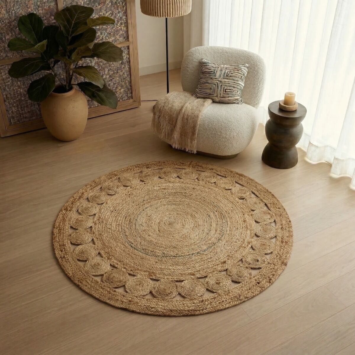 Sublime tapis rond tressé en jute parfait pour rendre une ambiance chaleureuse et ethnique.