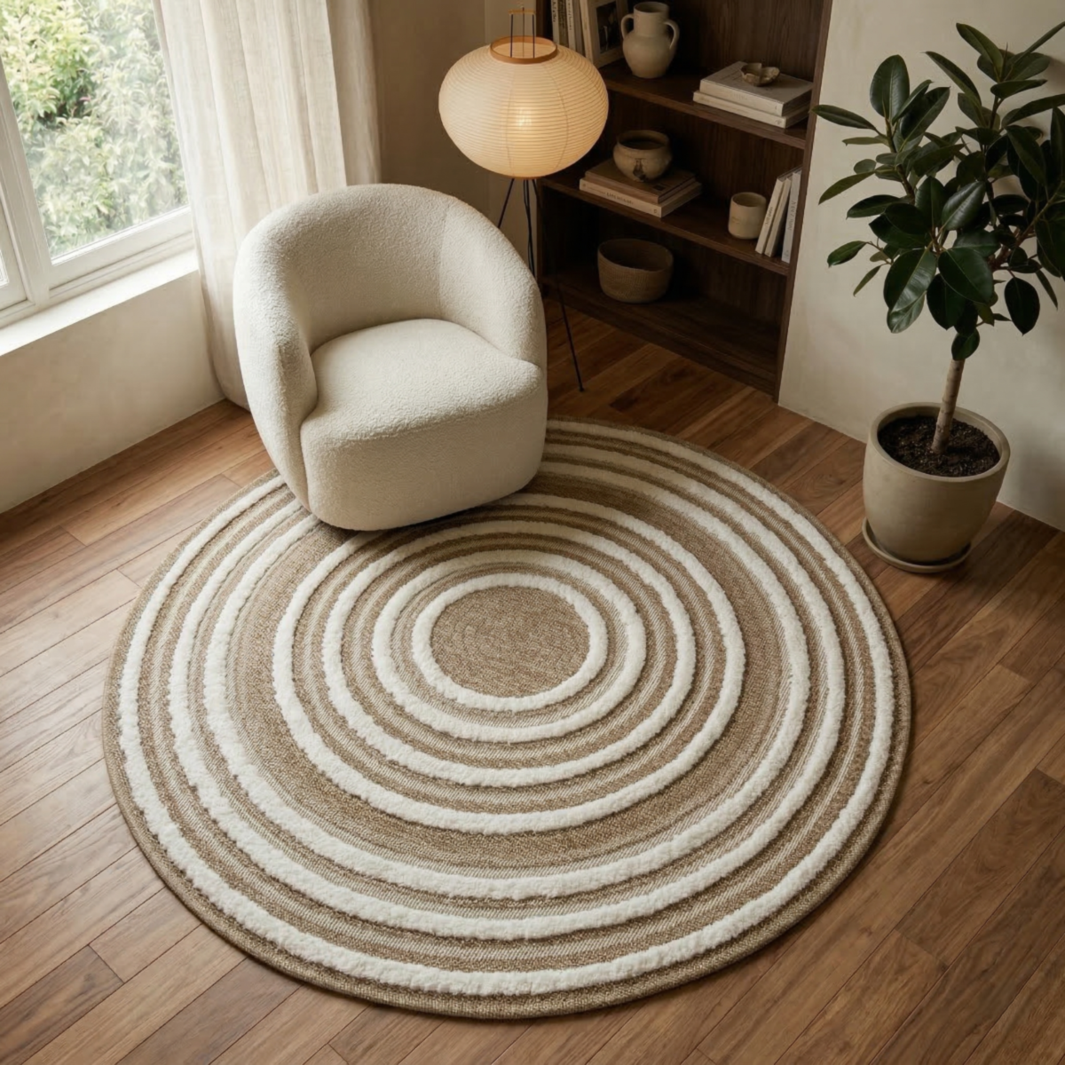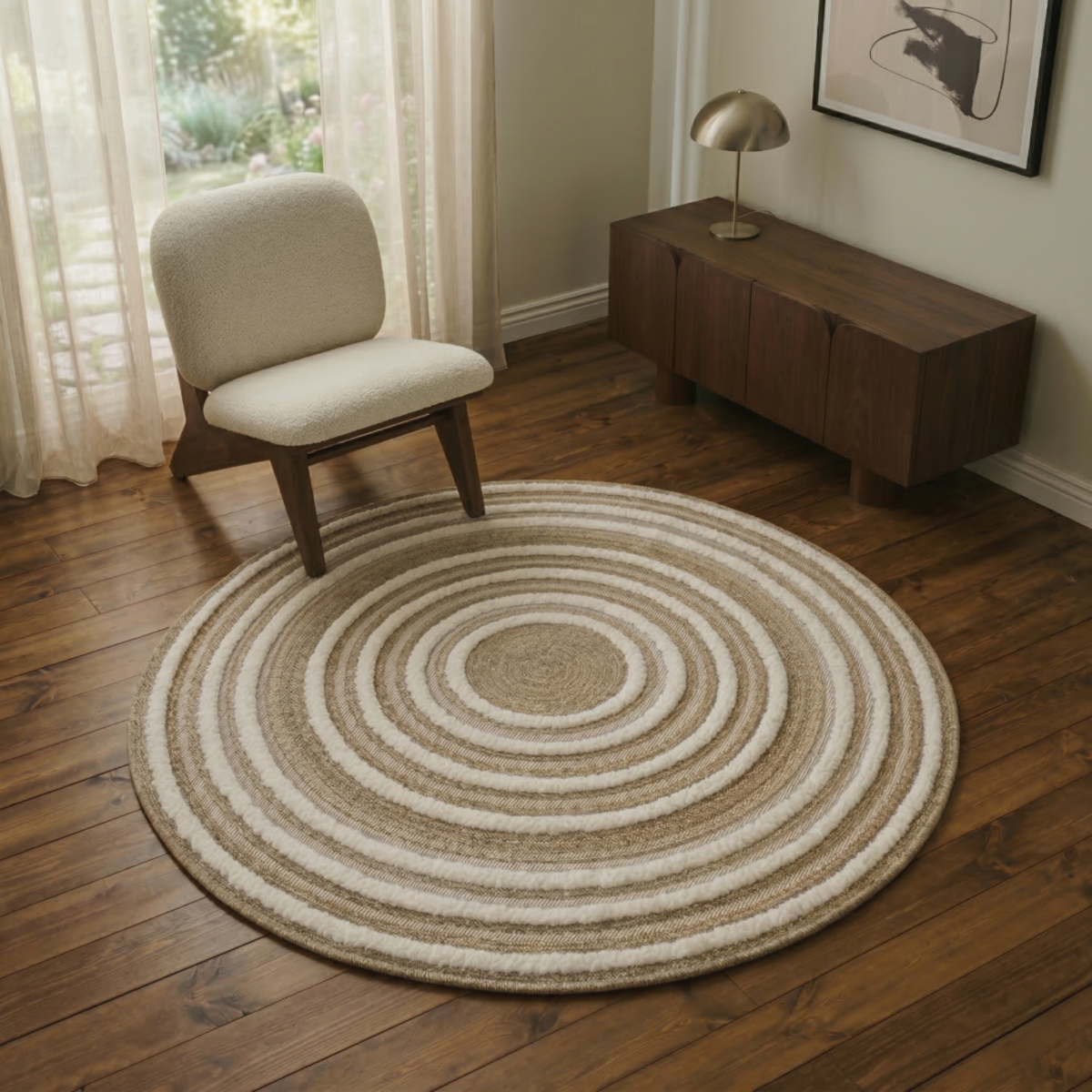 Tapis rond effet jute motifs en relief blanc diamètre 70