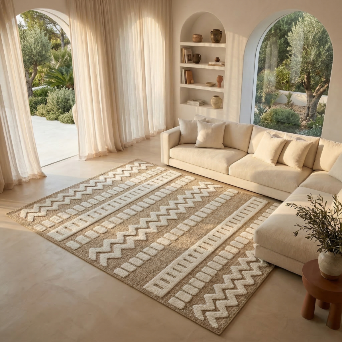 | description du produit_ES | Aporta un toque moderno a tu interior y exterior con esta alfombra certificada OEKO-TEX, efecto yute con motivos geométricos en relieve, de color natural. Esta colección de alfombras combina un diseño contemporáneo con facilidad de mantenimiento, integrándose armoniosamente en todos los espacios. • Composición: Polipropileno • Calidad: Fácil de mantener con una aspiradora o un paño húmedo • Certificado OEKO-TEX: Garantiza la ausencia de sustancias nocivas para la salud |