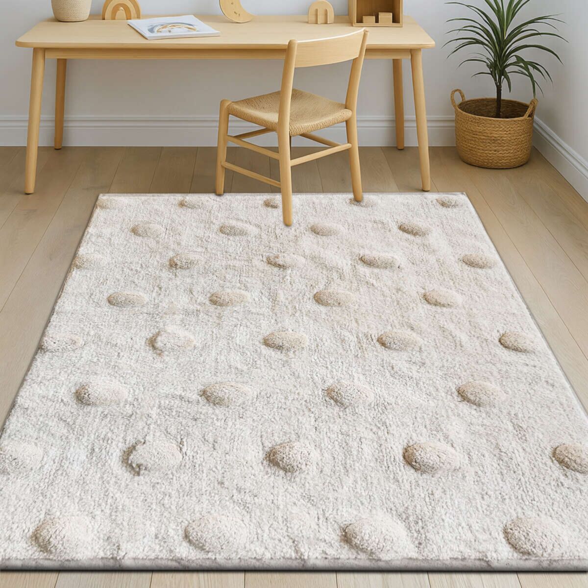 | description du produit_IT | Porta dolcezza e originalità nella cameretta dei tuoi bambini con il tappeto KIDS BIG DOTS. Realizzato artigianalmente in 100% cotone, questo tappeto fatto a mano conquista con il suo bel motivo in rilievo e la tonalità naturale, facile da abbinare a qualsiasi arredamento. Pratico e pensato per l’uso quotidiano, è lavabile in lavatrice: un vero vantaggio che unisce stile e praticità. |