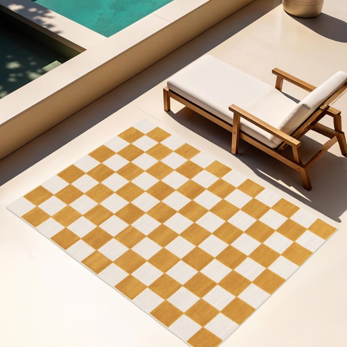 | description du produit_DE | Lassen Sie gute Laune in Ihr Zuhause (oder Ihren Außenbereich) einziehen – mit dem Teppich CHILL. Inspiriert vom schwungvollen Rhythmus des bekannten kubanischen Tanzes bringt dieser gelb-cremefarbene Karoteppich eine fröhliche, moderne Note in jeden Raum. Sein geometrisches Design und die lebendigen Farben verleihen Ihrem Zuhause positive Energie und einen stilvollen Akzent – perfekt für Wohnzimmer, Terrasse oder Schlafzimmer. Wir lieben: - Oeko-Tex-zertifiziert, Garant für textile Qualität und Sicherheit - Hergestellt in Europa, Synonym für Handwerkskunst und Langlebigkeit - Design: modernes Karo in Honiggelb und gebrochenem Weiß - Struktur: raffinierte Kombination aus flacher Webart und weicher, erhabener Oberfläche mit 3D-Effekt - Farben: Senfgelb und neutrales Creme für eine sonnige, elegante Atmosphäre - Verarbeitung: kurze Seiten gefaltet und geklebt, lange Seiten sorgfältig gekettelt Komfort & Pflege: - Fusselfrei und leicht zu reinigen - UV-beständig – die Farben bleiben dauerhaft leuchtend - Für Fußbodenheizung geeignet - Leicht und flexibel – einfach zu bewegen und neu zu arrangieren |