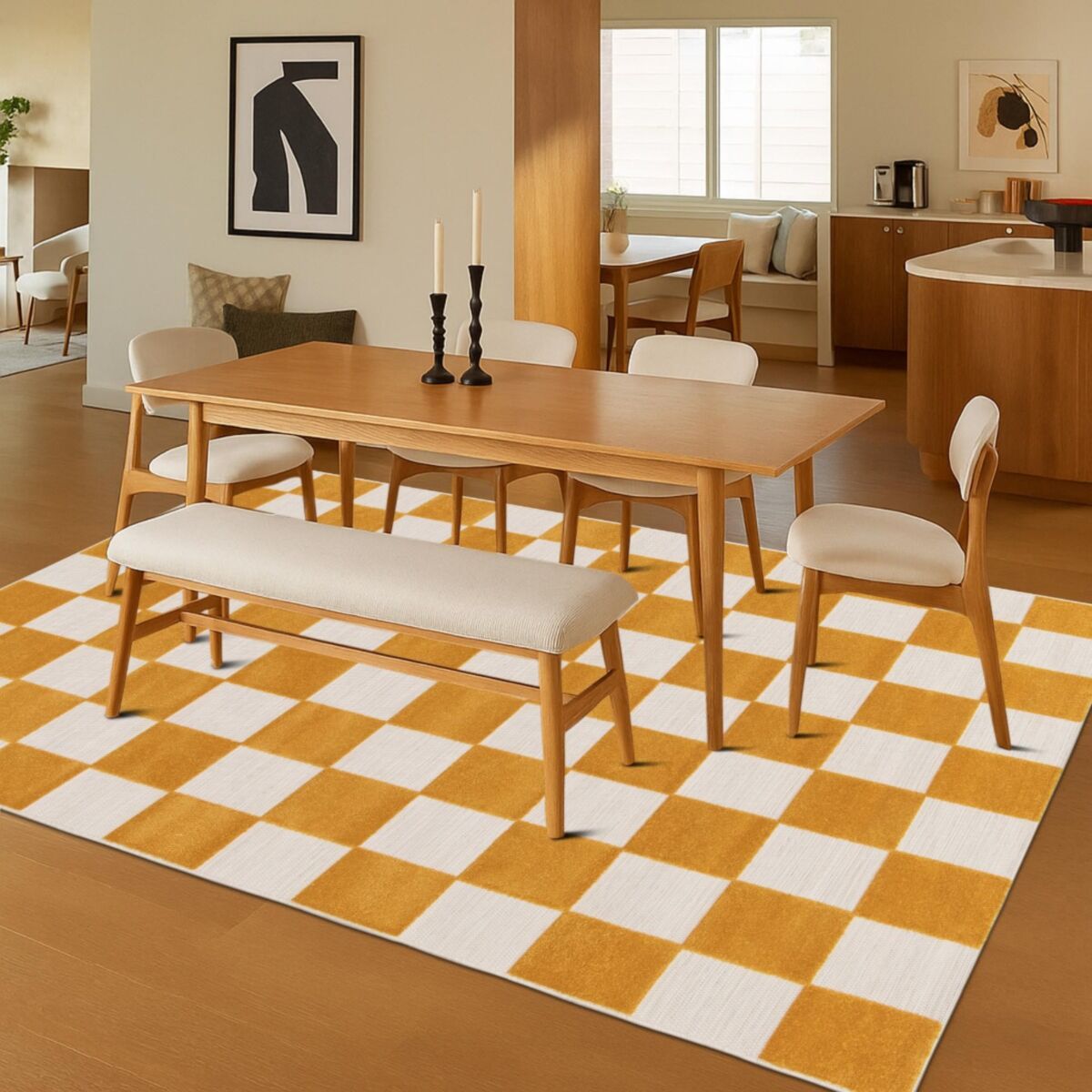 - Motif : damier moderne jaune miel et blanc cassé