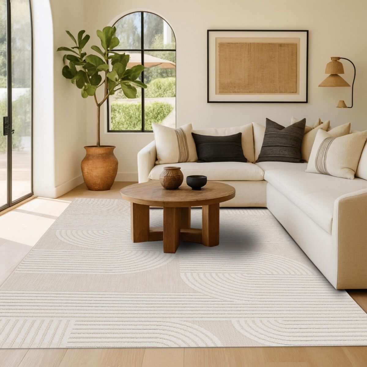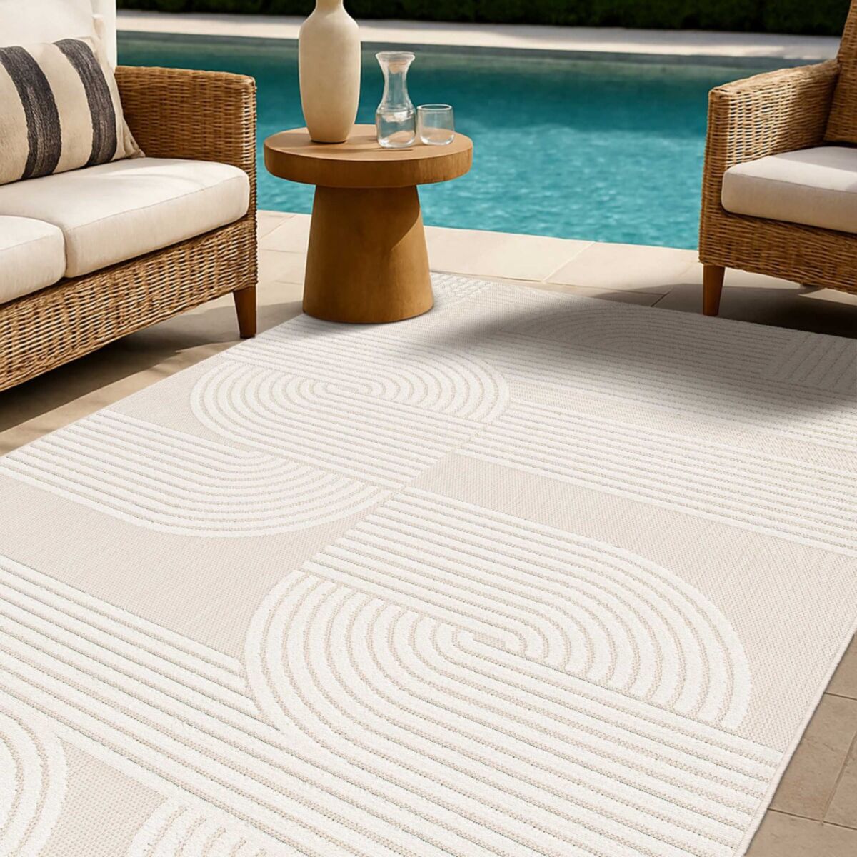 | description du produit_ES | La alfombra CHILL MODULO es una invitación a combinar estética y practicidad, tanto en interiores como en exteriores. Inspirada en las formas redondeadas y los motivos gráficos del estilo retro, esta alfombra presenta una composición de líneas entrelazadas en semicírculos, tono sobre tono, que juegan con la luz y la textura para crear un efecto de relieve sutil pero elegante. Fabricada en polipropileno estabilizado con UV, la CHILL Cream es perfectamente adecuada para un uso exterior: resiste la decoloración provocada por el sol y mantiene su aspecto con el paso del tiempo. Su superficie alterna un tejido plano natural con un vellón cut-pile de 5 mm, ofreciendo una sensación agradable bajo los pies y una textura visualmente rica. El tono crema combinado con el blanco suave aporta dulzura, luminosidad y calidez a cualquier espacio. Gracias a su material no desprendente, esta alfombra no pierde fibras, lo que facilita su mantenimiento diario. Puede utilizarse sobre suelo radiante y se limpia fácilmente con aspiradora o agua. Es, por tanto, una elección ideal para quienes buscan una alfombra de diseño, resistente y fácil de cuidar. Encuentra fácilmente su lugar en un salón, un dormitorio, una entrada o incluso en una terraza o un balcón, aportando un toque decorativo armonioso y contemporáneo. |