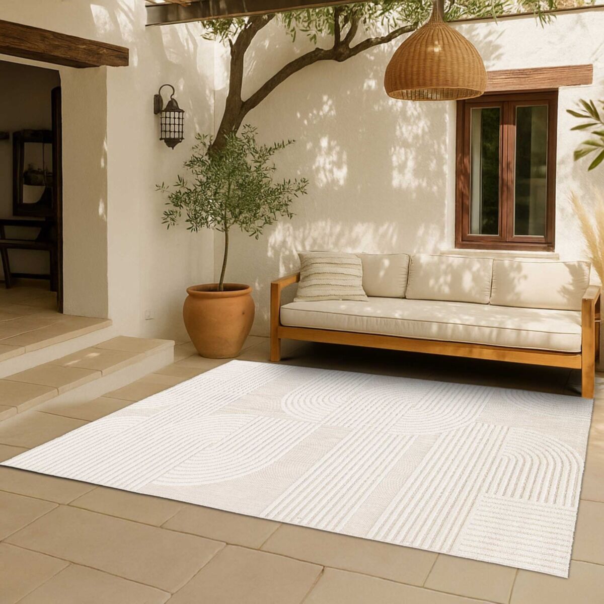Conçu à partir de polypropylène stabilisé aux UV, le CHILL Cream est parfaitement adapté à un usage extérieur : il résiste à la décoloration causée par le soleil et conserve sa tenue dans le temps. Sa surface alterne entre un tissage plat naturel et un velours cut-pile de 5 mm, offrant un toucher agréable sous les pieds et une texture visuellement riche. La teinte crème associée au blanc duveteux apporte douceur, luminosité et chaleur à tout type d’espace.