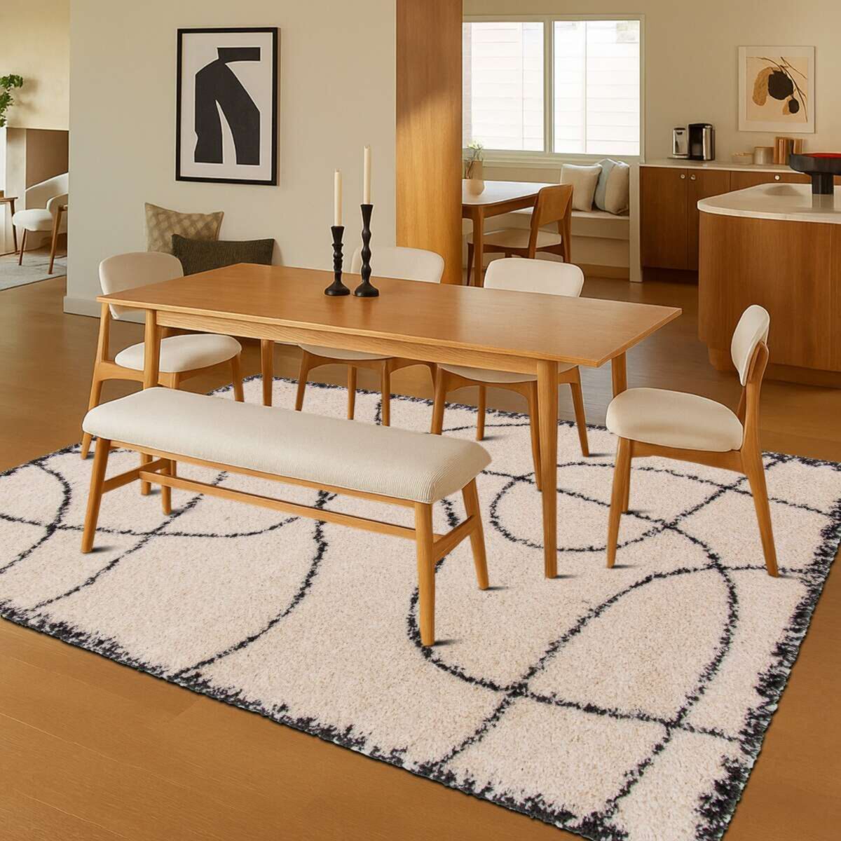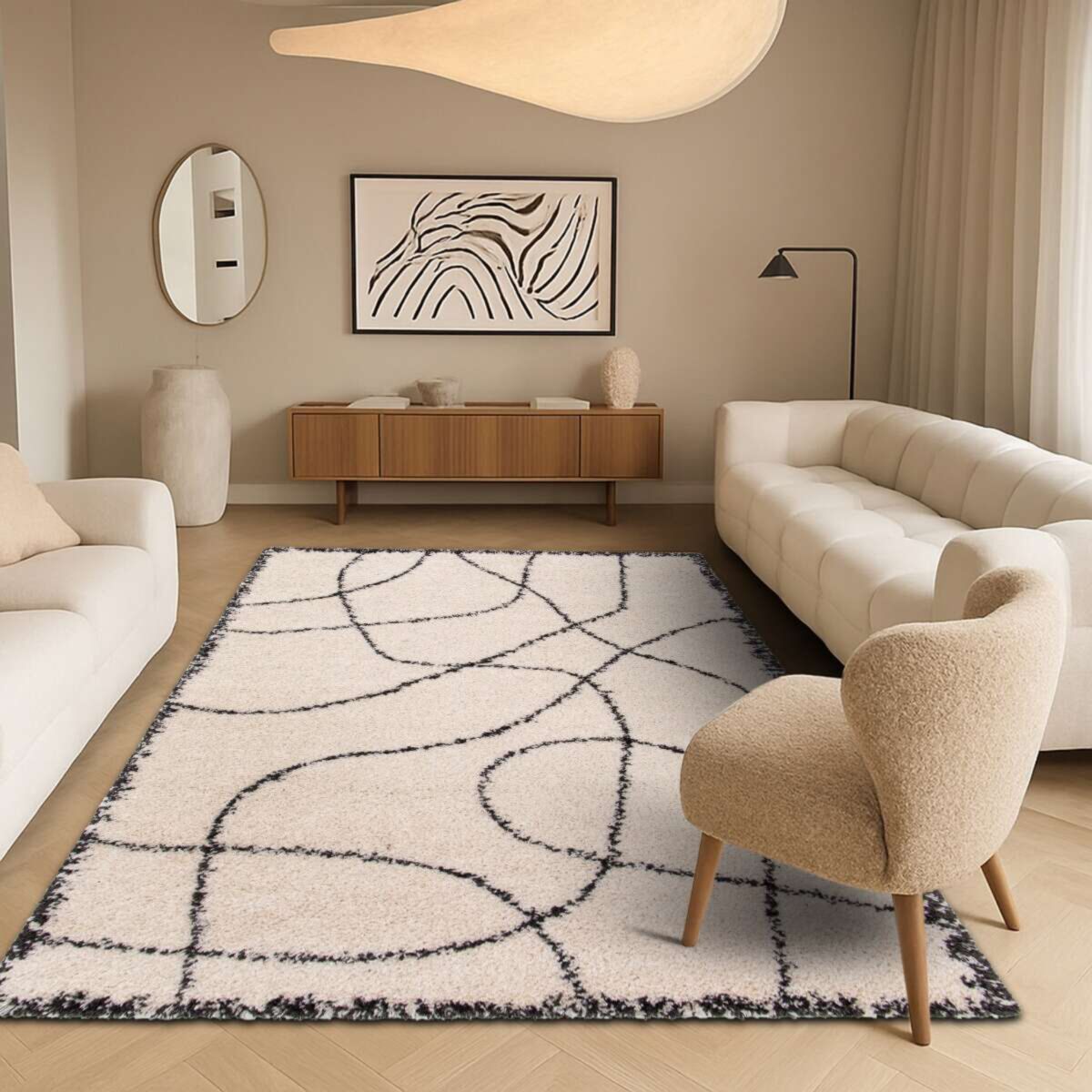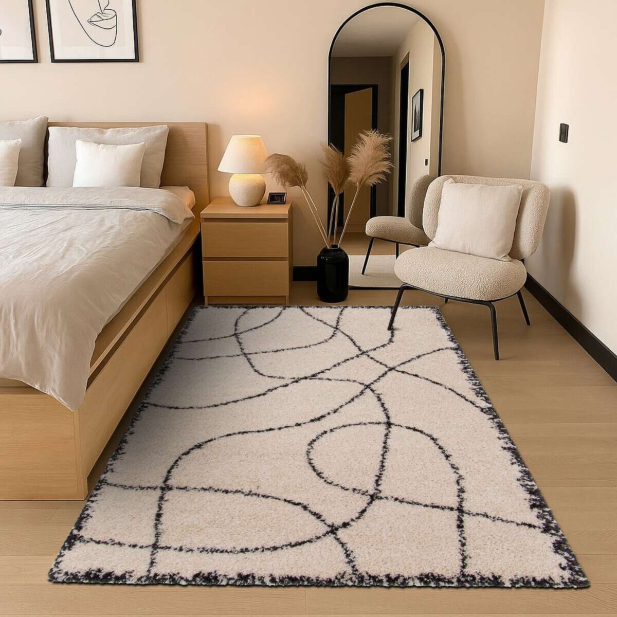 Doux, épais et moelleux, il invite au confort tout en apportant un style moderne grâce à son fond crème épuré rehaussé de lignes noires abstraites.