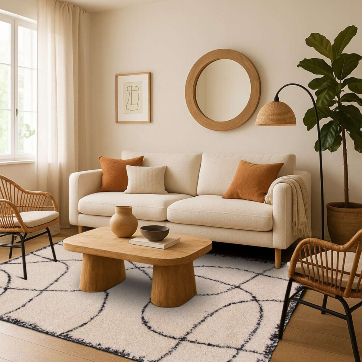 Sa finition inspirée du style berbère et scandinave en fait un choix idéal pour un salon cosy, une chambre cocooning ou un espace de vie au style bohème chic.