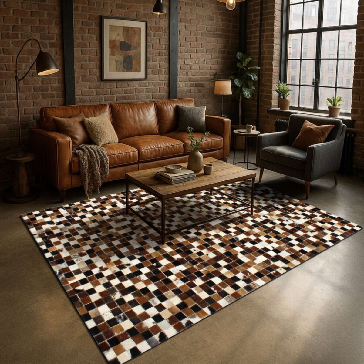 Tapis en cuir recyclé motif damier marron 120x170