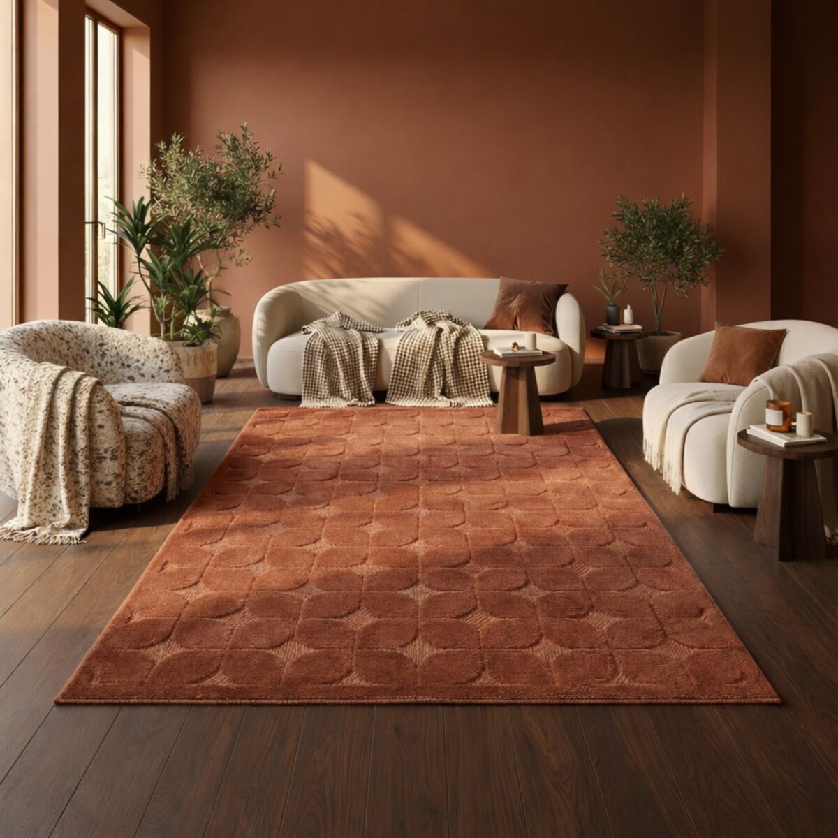 Avec son motif graphique inspiré des années 50 et sa couleur terracotta chaude et enveloppante, ce tapis apporte immédiatement du caractère à un espace. Son relief subtil capte la lumière et crée une belle profondeur visuelle, sans surcharger l’ambiance.