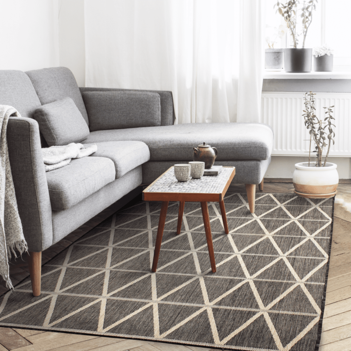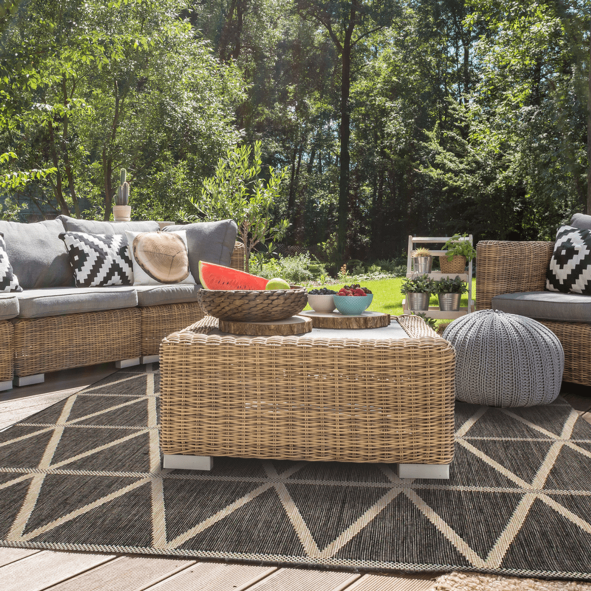 Tapis gris à motifs géométrique, 120x170cm. Sa composition résistante à l'eau lui permettra de trouver sa place tant dans votre salon, que sur votre terrasse, sous un salon de jardin par exemple.