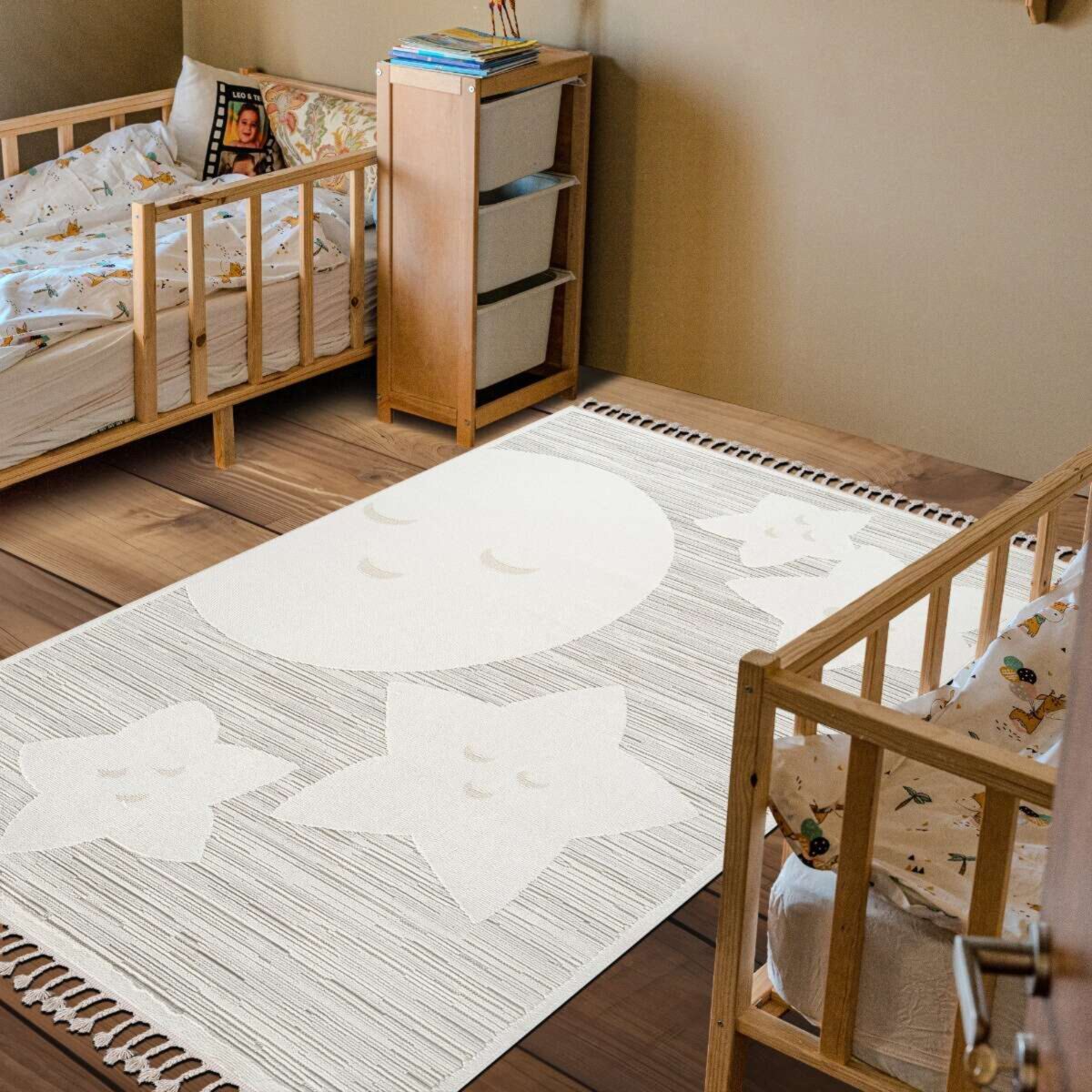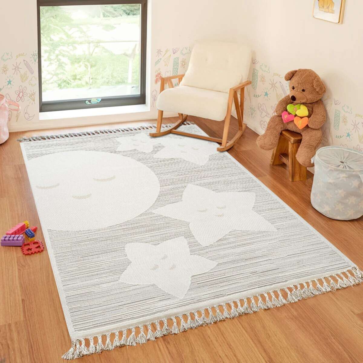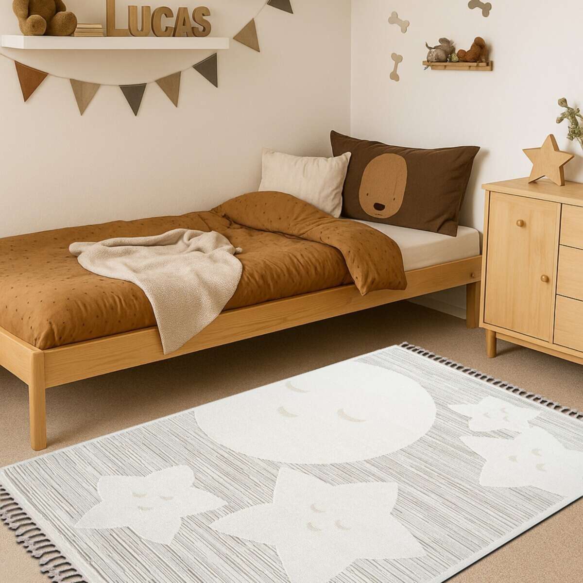 Ce tapis allie praticité et tendresse : il offre un espace confortable pour jouer au sol, lire ou rêver, tout en décorant joliment la chambre. Ses motifs étoilés favorisent un univers féérique et rassurant, parfait pour accompagner les doux rêves des plus petits.