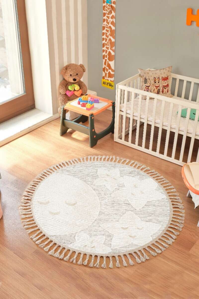 | description du produit_ES | Aporta calidez, dulzura y fantasía a la habitación de tu hijo con la colección de alfombras redondas ANIMOTIFS. Diseñadas en tonos neutros y relajantes, estas alfombras representan encantadores animales con expresiones tiernas: un oso soñador, un león sonriente y muchos otros compañeros imaginarios. Su diseño poético y reconfortante estimula la creatividad y crea un ambiente sereno, perfecto para jugar, leer o relajarse. ¿Por qué nos encantan? Estas alfombras combinan practicidad y ternura: ofrecen un espacio cómodo y mullido para jugar en el suelo, al tiempo que aportan un toque decorativo cálido a la habitación. Su estilo minimalista y sus flecos delicados se adaptan fácilmente a cualquier decoración: escandinava, bohemia o natural. Características: • Forma: redonda • Material: 100 % poliéster suave • Certificación: OEKO-TEX® Standard 100 (garantizado sin sustancias nocivas) • Colores: beige, crudo, gris claro • Acabado: flecos trenzados alrededor • Fácil mantenimiento: limpieza localizada con agua tibia y secado al aire libre El pequeño extra: Cada modelo de la colección cuenta una historia e invita a soñar: el oso representa la dulzura, el león el coraje, y otros motivos despiertan la curiosidad y ternura de los más pequeños. |