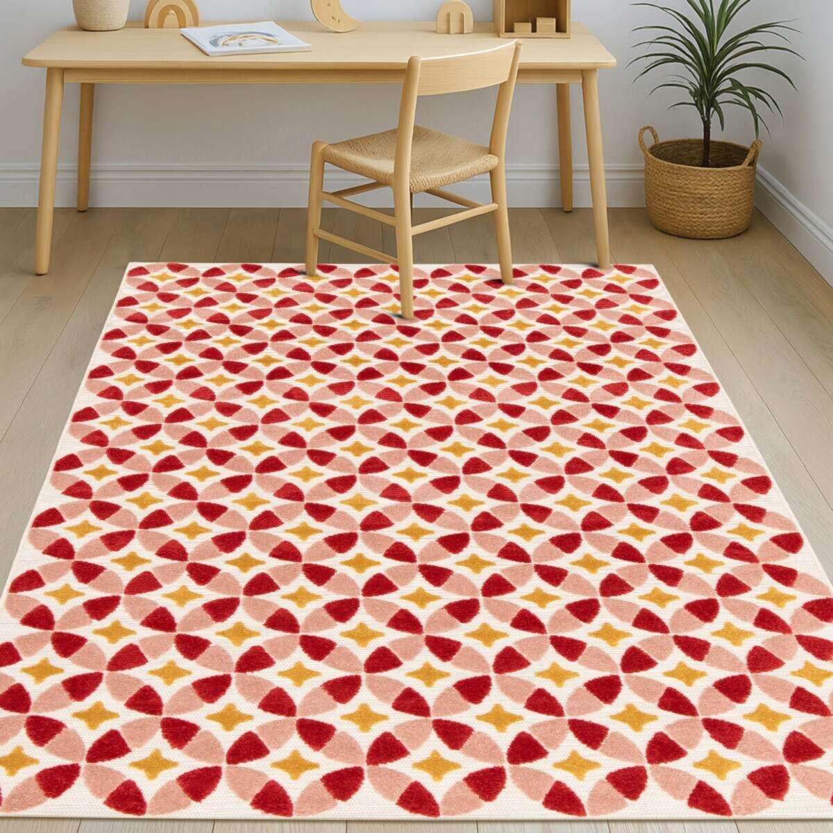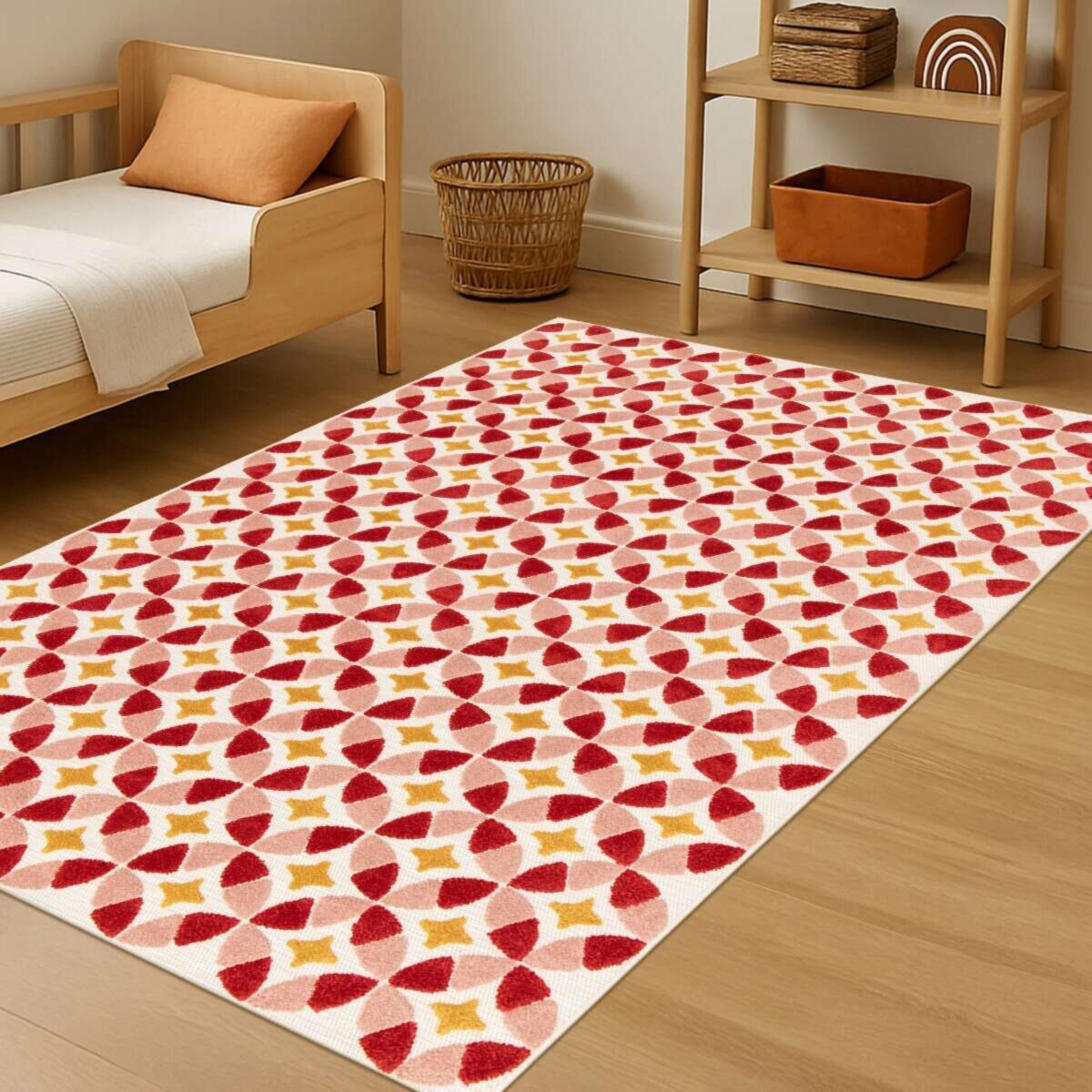 Son motif géométrique coloré mêlant rouge, rose et jaune crée une atmosphère pleine de bonne humeur, idéale pour stimuler l’imagination et la créativité des petits.