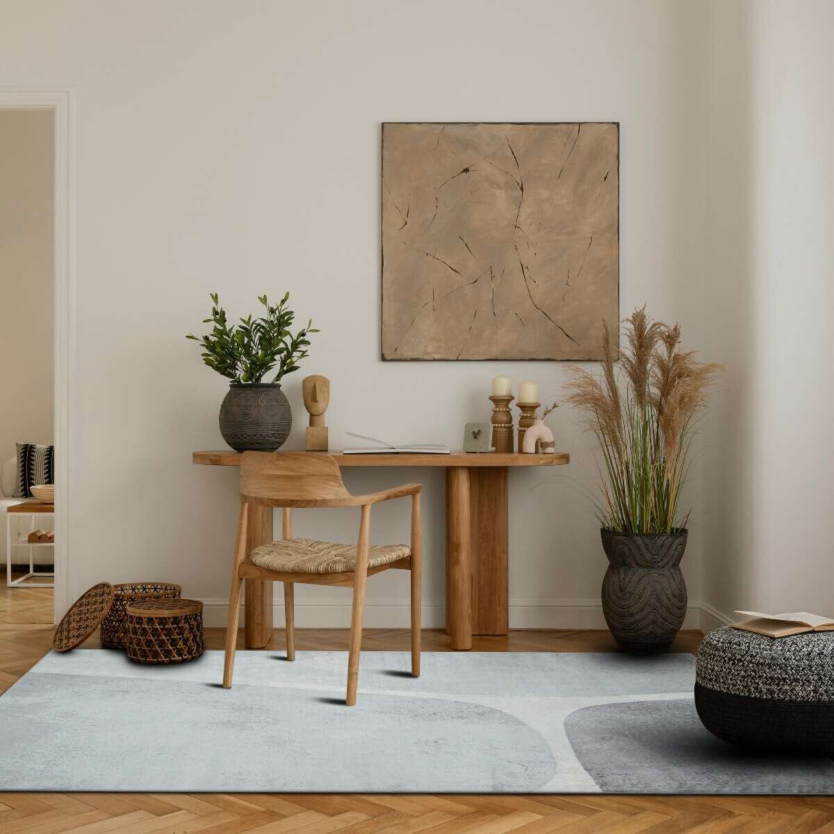 Graphique mais discret, ce tapis structure l’espace avec équilibre et douceur, apportant une ambiance apaisante à votre salon, chambre ou bureau.