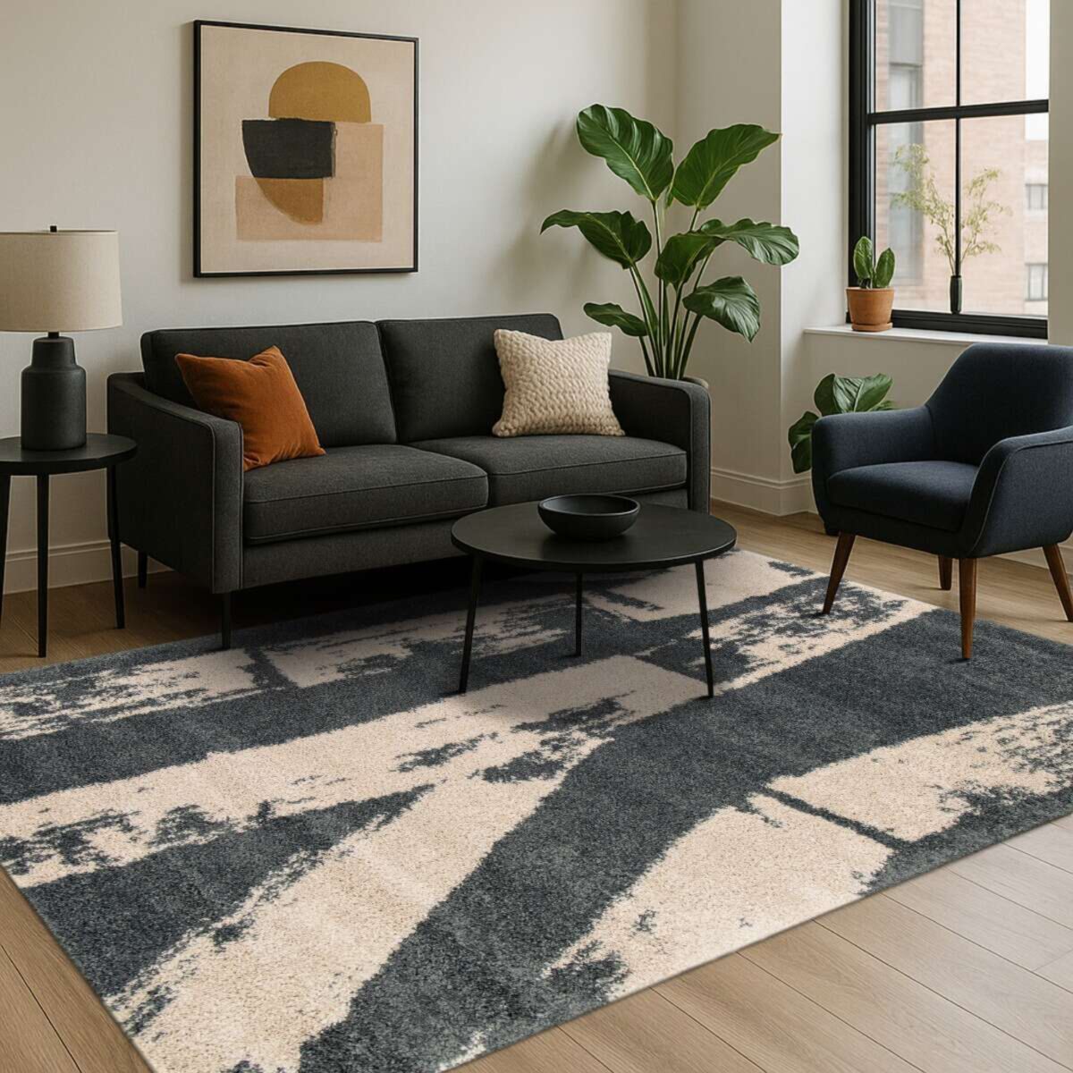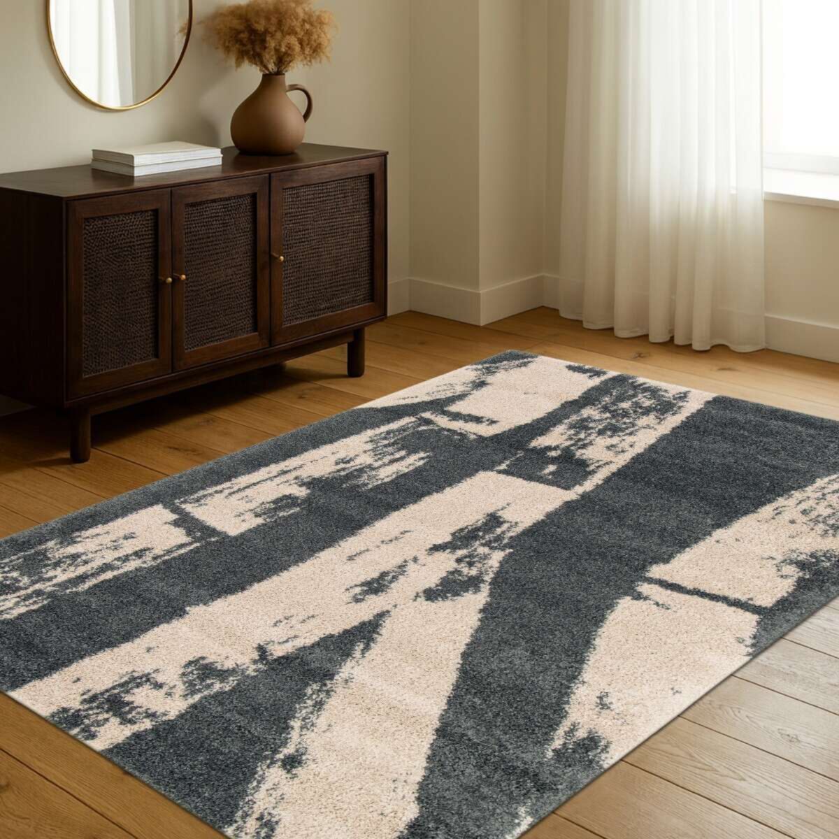 Ses nuances de beige et de gris anthracite, relevées par un motif abstrait au rendu artistique, créent une ambiance à la fois contemporaine et apaisante.