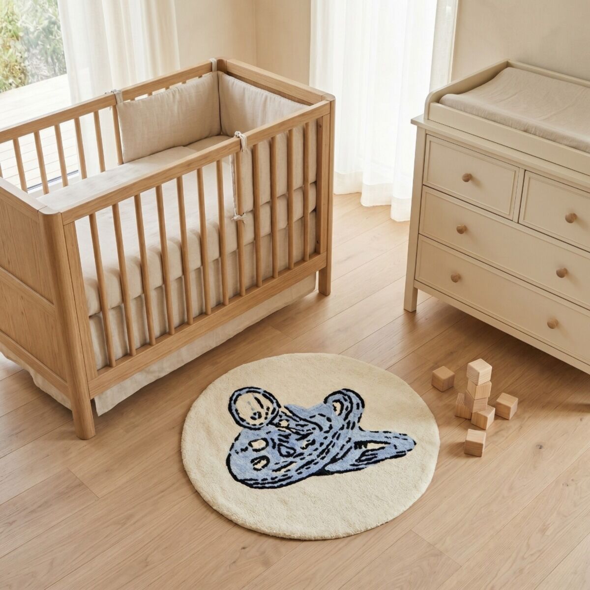 Tapis rond en coton au design doux et moderne, avec un motif de tétine bleue sur fond écru. Idéal pour une chambre de bébé, il apporte une touche tendre et actuelle à la décoration.